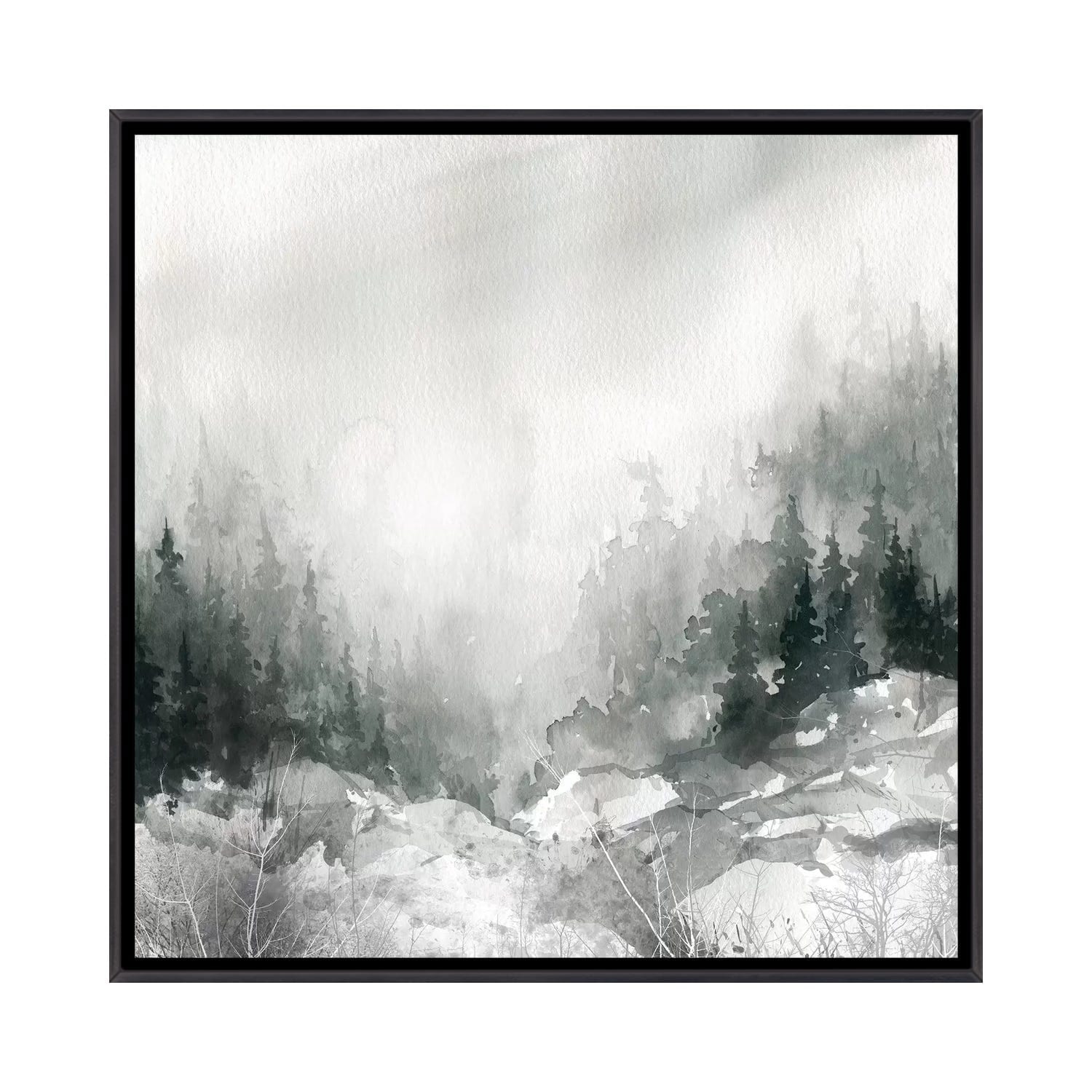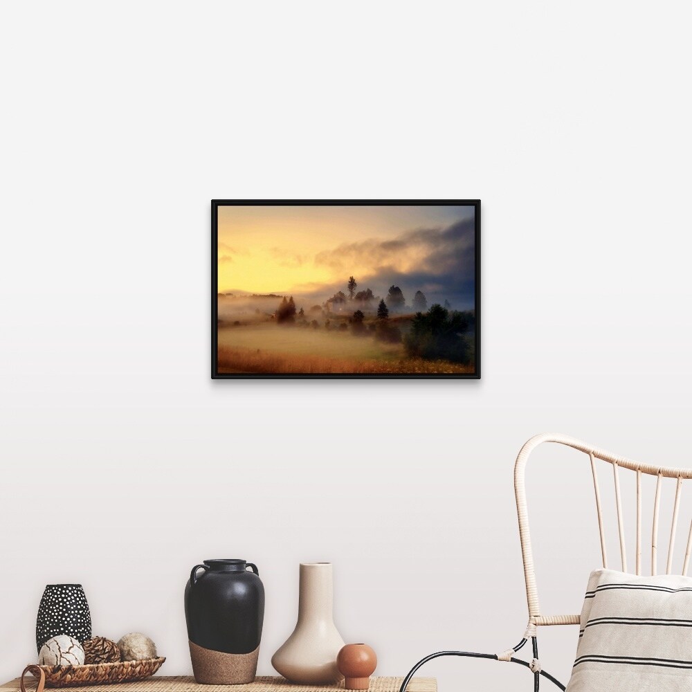 "Little Croatian village in mist at dusk." Black Float Frame Canvas Art