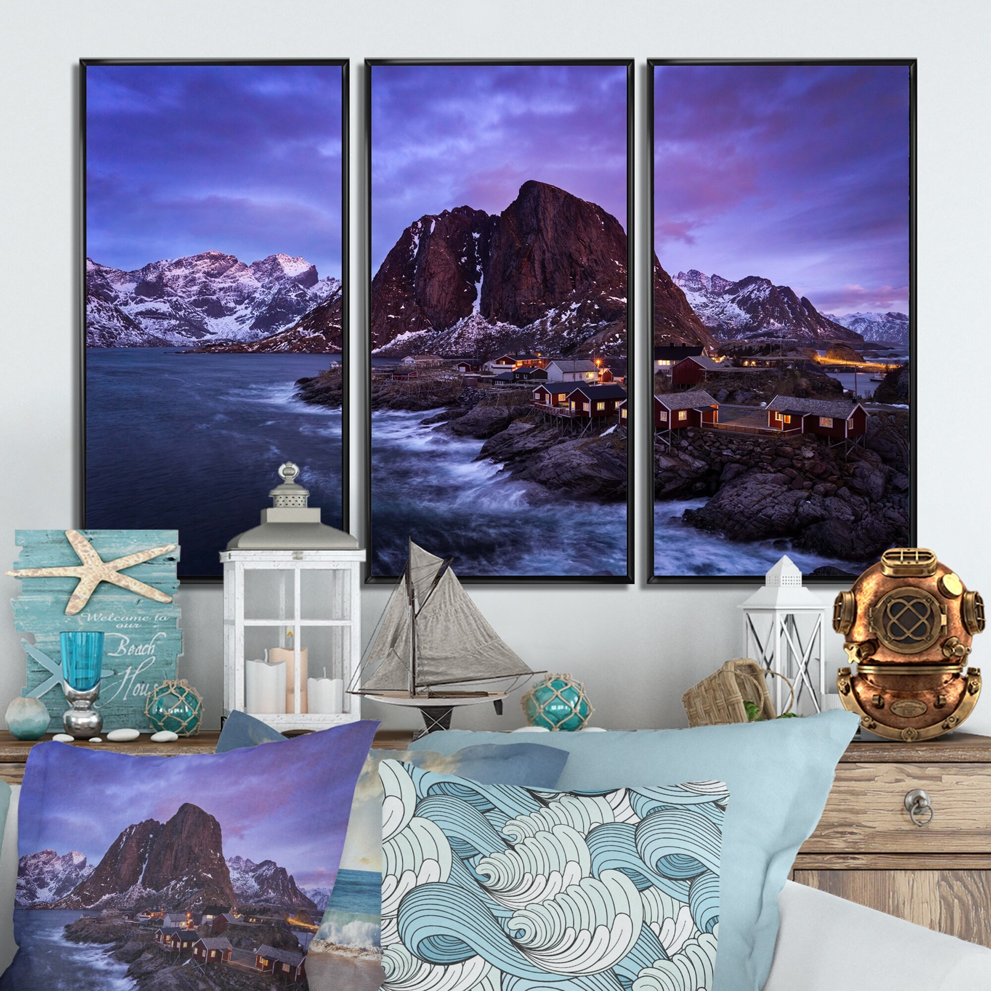 Designart "Fishing Village With Houses in Homnoya At Dusk" Nautical & Coastal Framed Art Set of 3 - 4 Colors of Frames