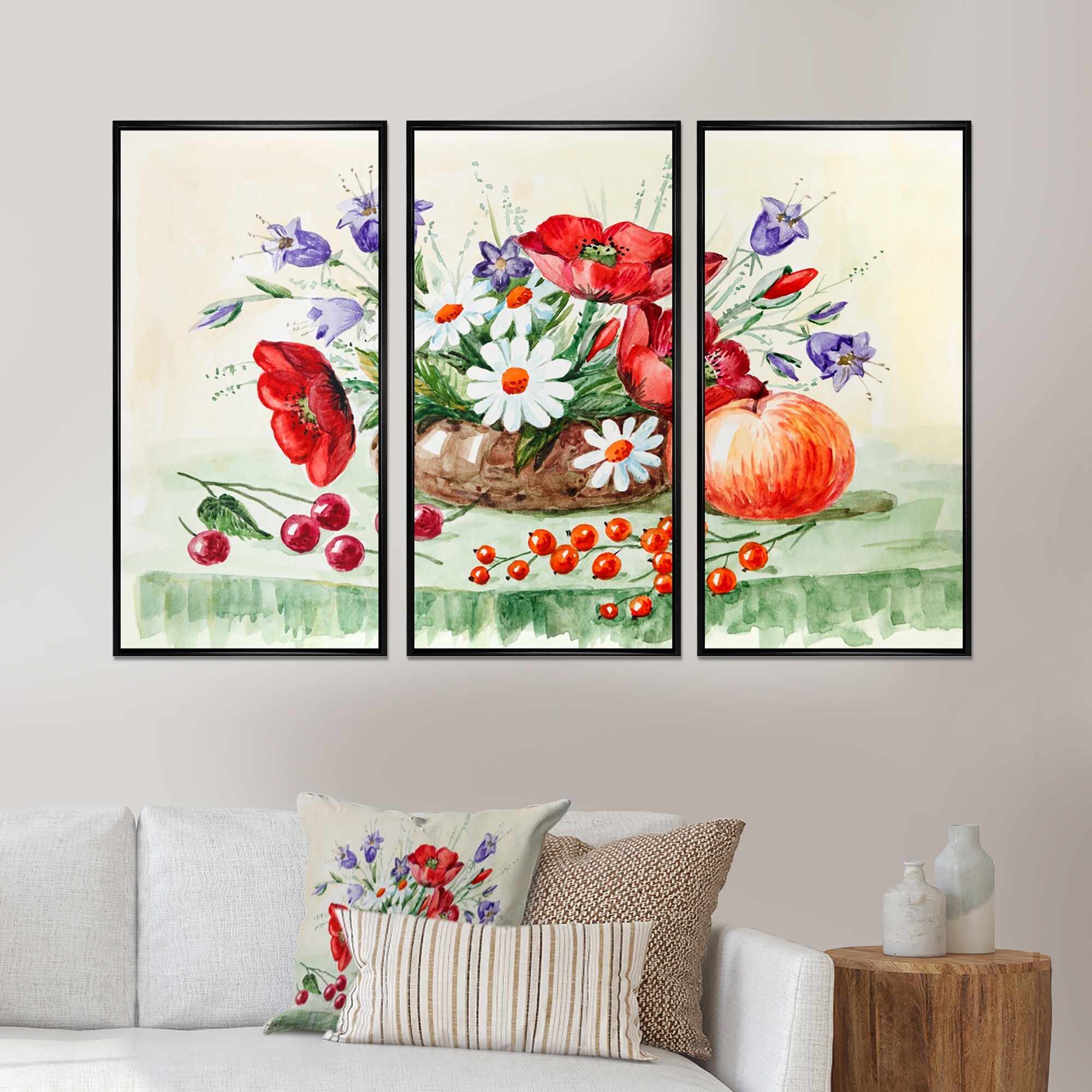 Designart "Colorful Bunch of Flowers and Fruits" Floral Framed Artwork Set of 3 - 4 Colors of Frames