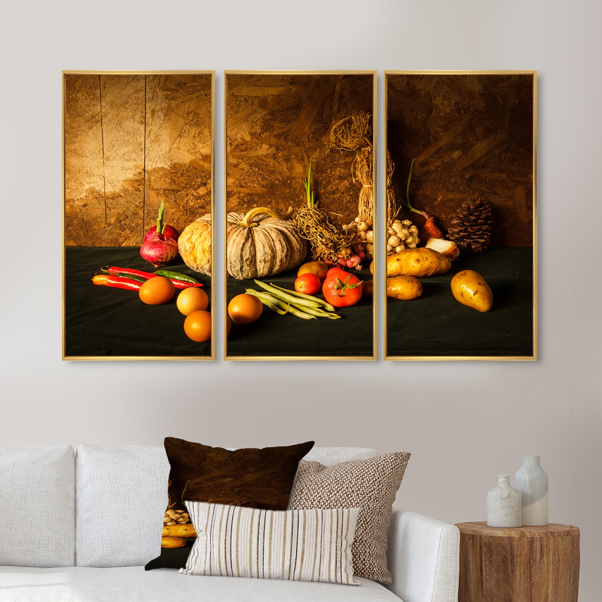 Designart "Vegetables and Fruits in Brown Background" Food Framed Wall Decor Set of 3 - 4 Colors of Frames