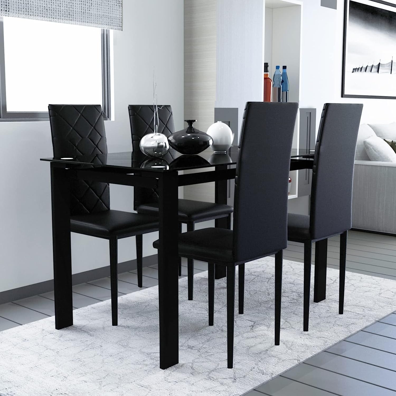 5 Pieces Black Tempered Glass Dining Table Set for 4 with Faux Leather Chairs, Complete Dining Set, Comfortable Design