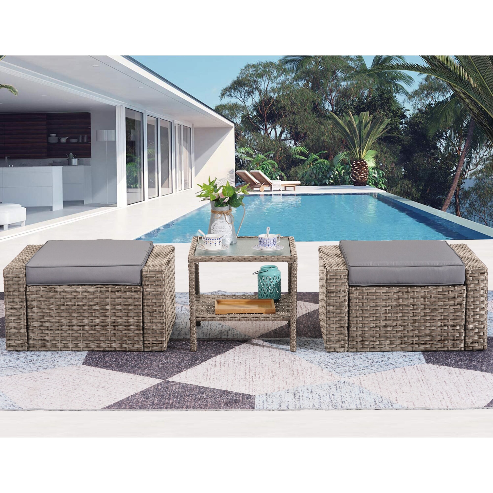3 Piece Outdoor Ottomans with Glass Coffee Table
