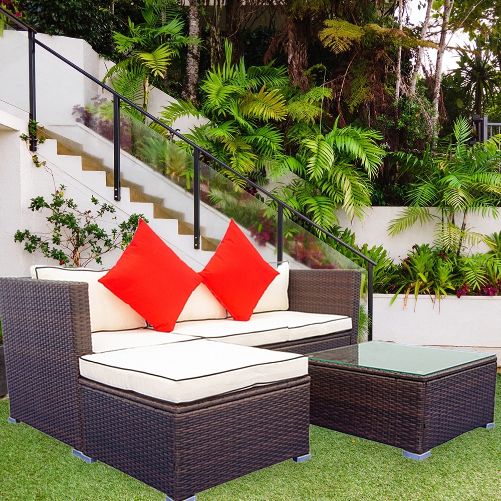 3 piece Rattan Patio Outdoor Furniture Set with Cushions&Glass Table