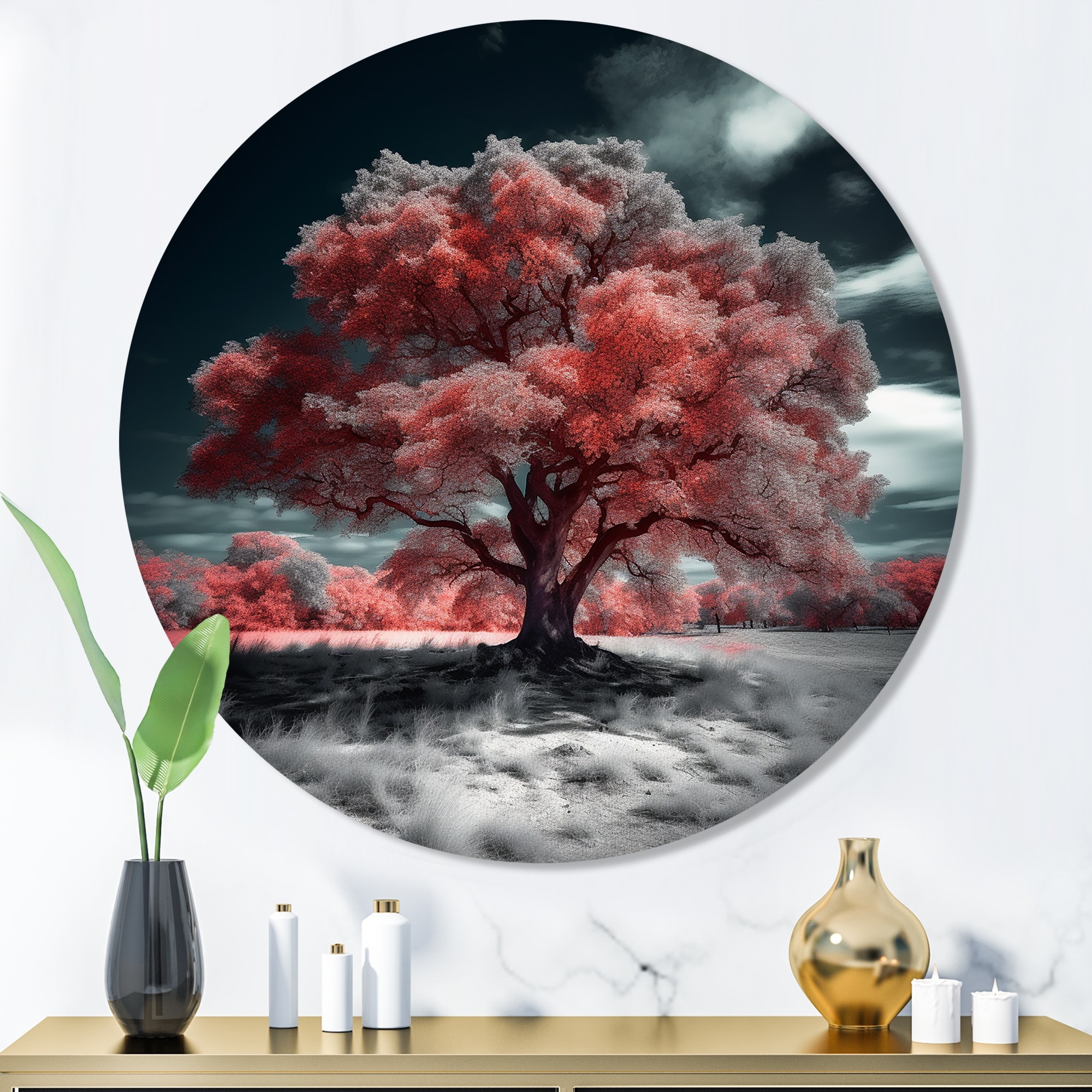 Designart "Red Tree Blossom Haven II" Tree Floral Metal Round Wall Art