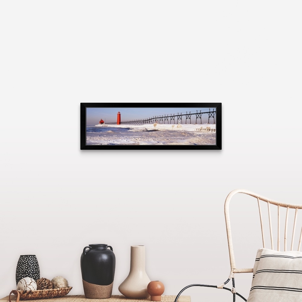 "Lighthouse near a pier, Grand Haven, Michigan" Black Framed Print
