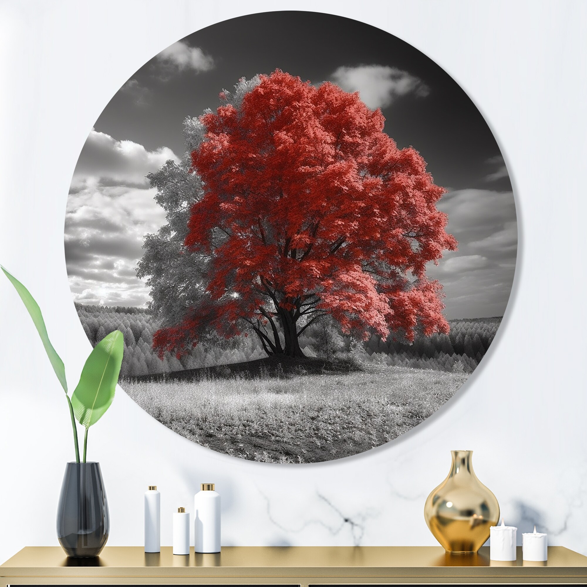 Designart "Red Tree Winter Haven" Tree Floral Metal Round Wall Art