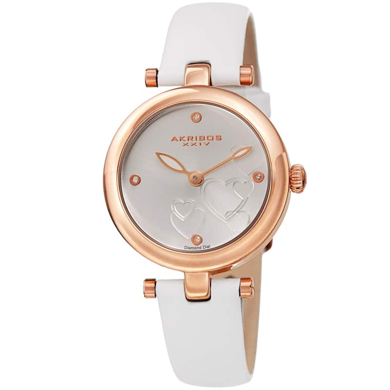 Akribos XXIV Ladies Diamond Heart Barbell Lugs White Leather Strap Watch