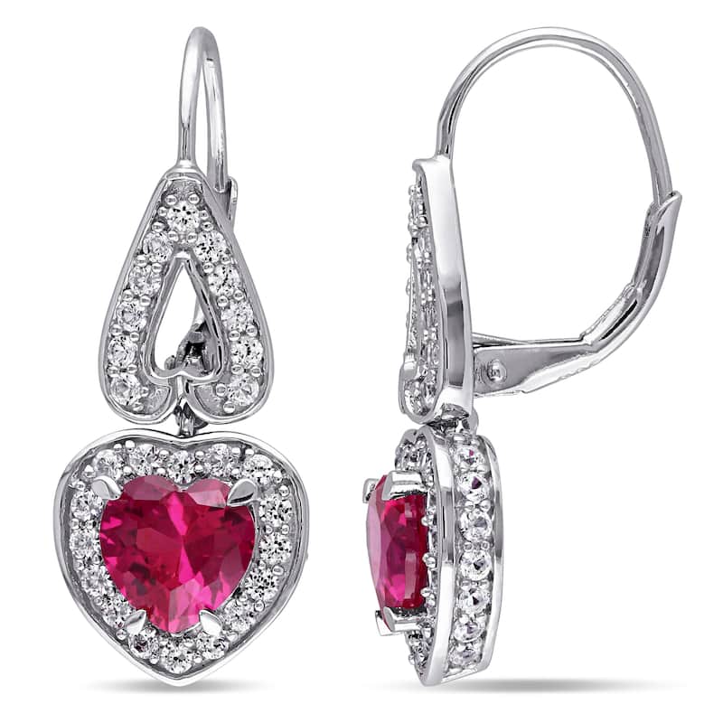 Miadora Sterling Silver Created White Sapphire and Created Ruby Heart Dangle Earrings - Red