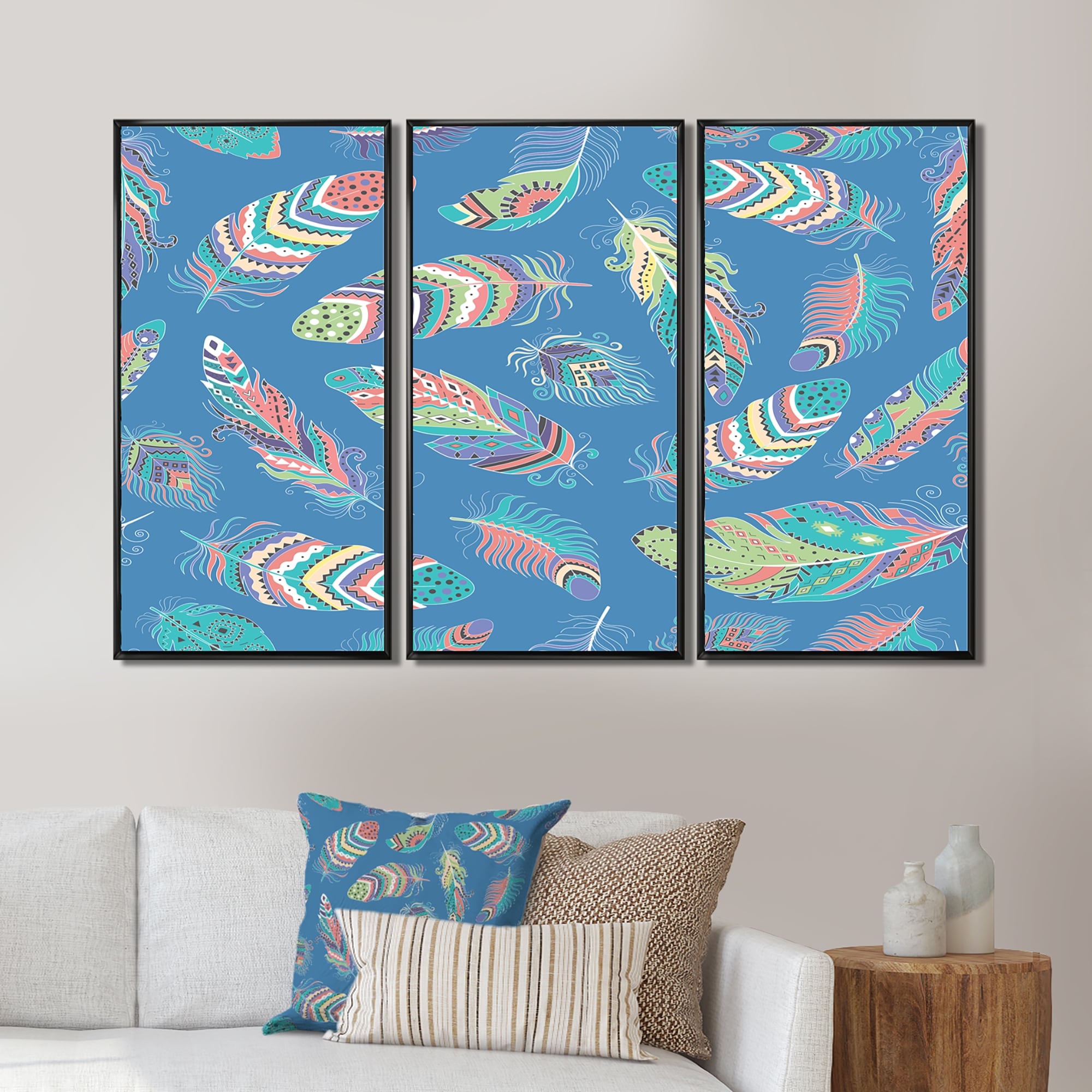 Designart "Blue Hippie Boho Feathers I" Bohemian Framed Canvas Wall Art Set of 3 - 4 Colors of Frames