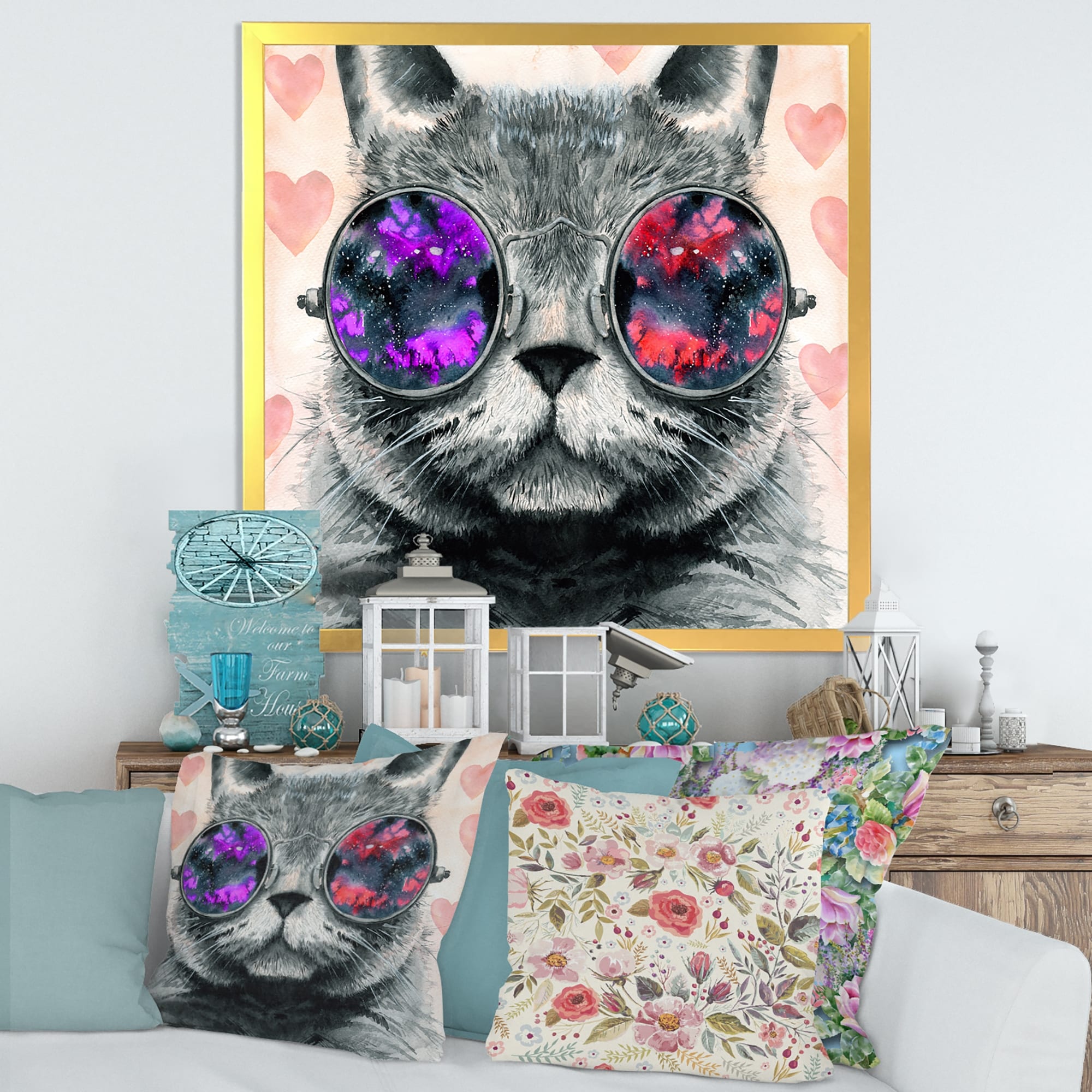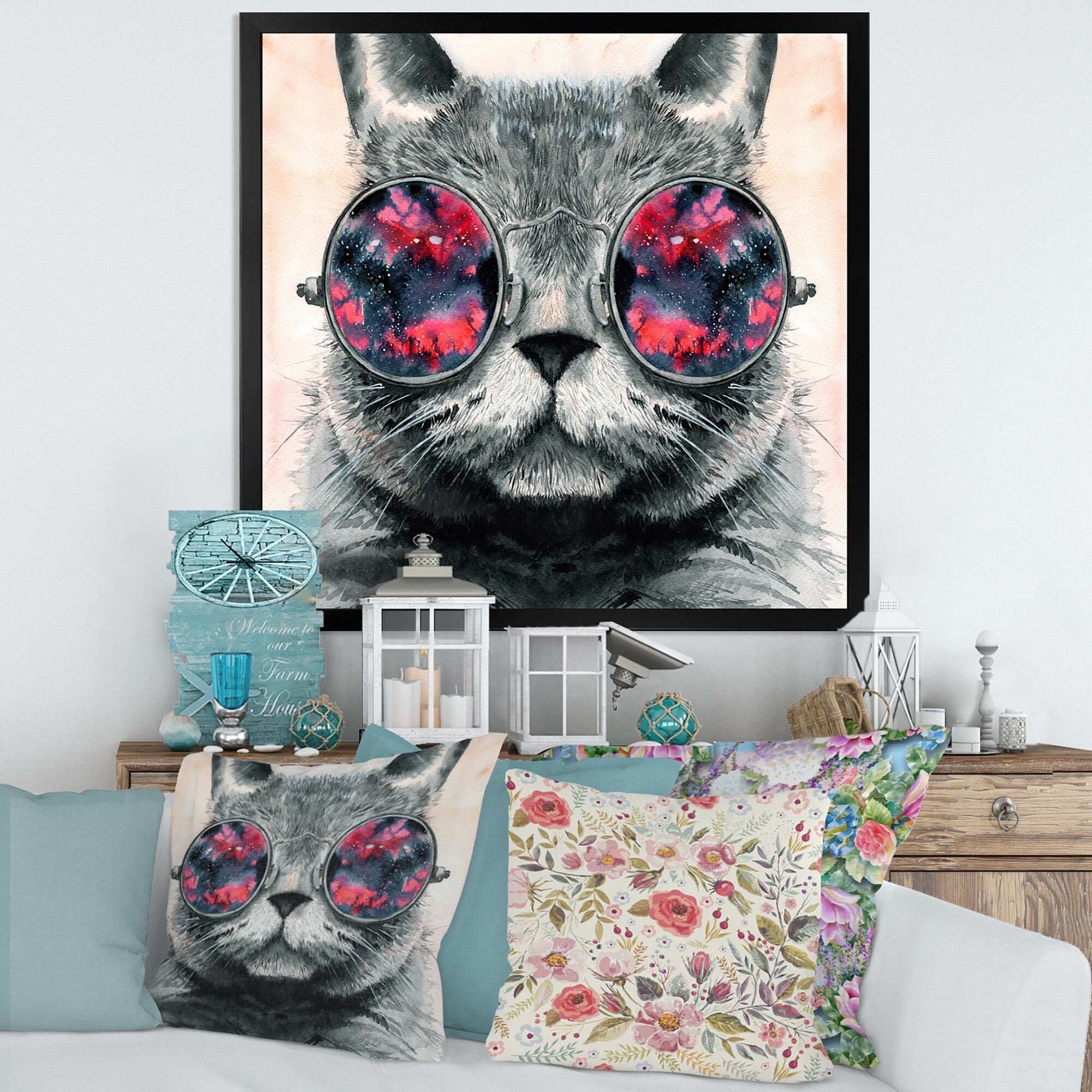 Designart "Grey Fluffy Cat in Round Hippie Glasses I" Modern Framed Art Print