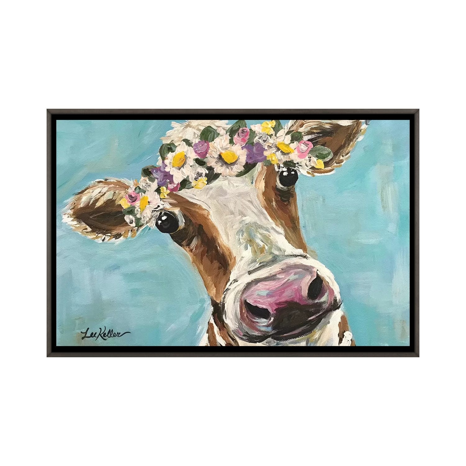 iCanvas "Cow With Flower Crown on Turquoise" by Hippie Hound Studios Framed