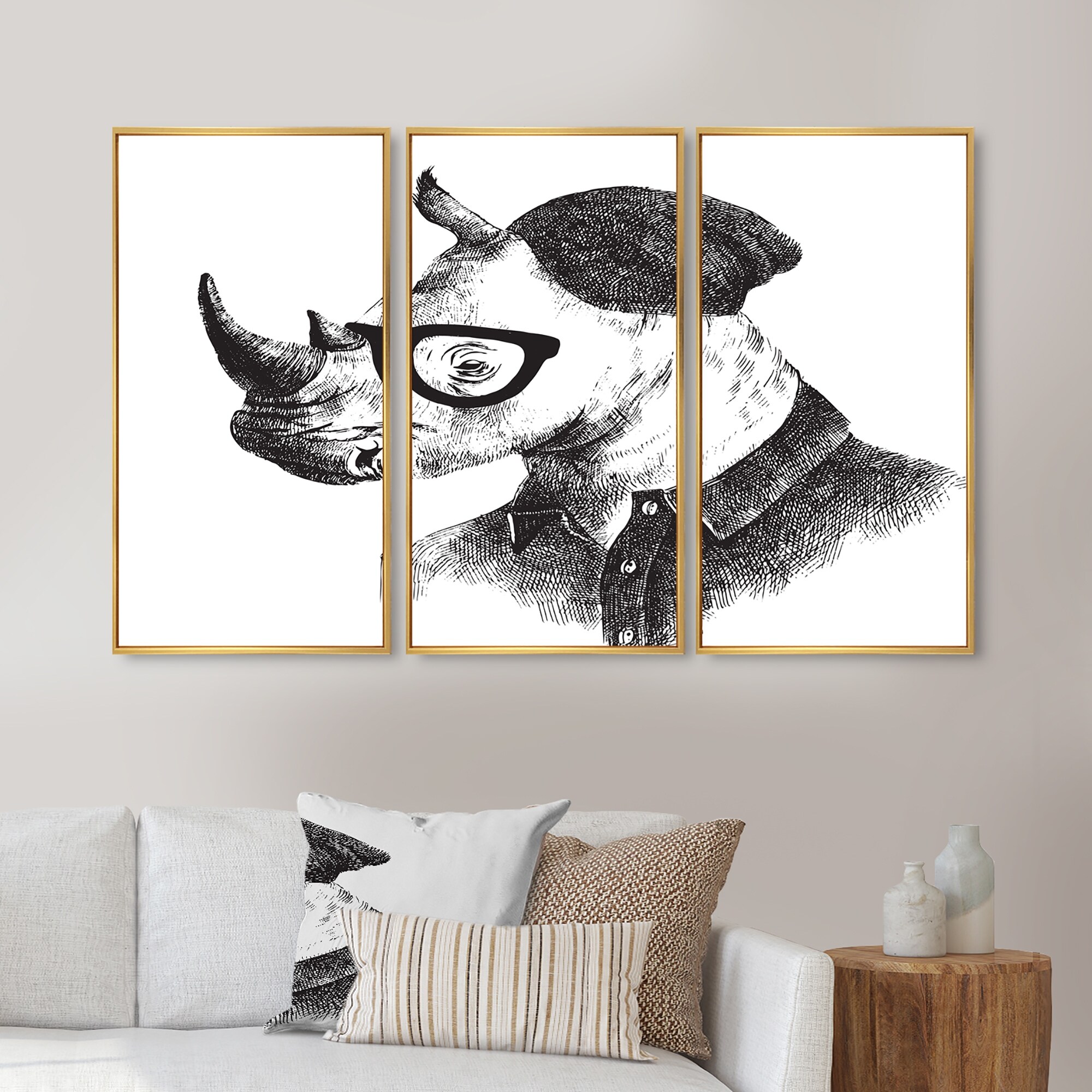 Designart "Hipster Rhino in Black and White" Animal Framed Wall Art Set of 3 - 4 Colors of Frames