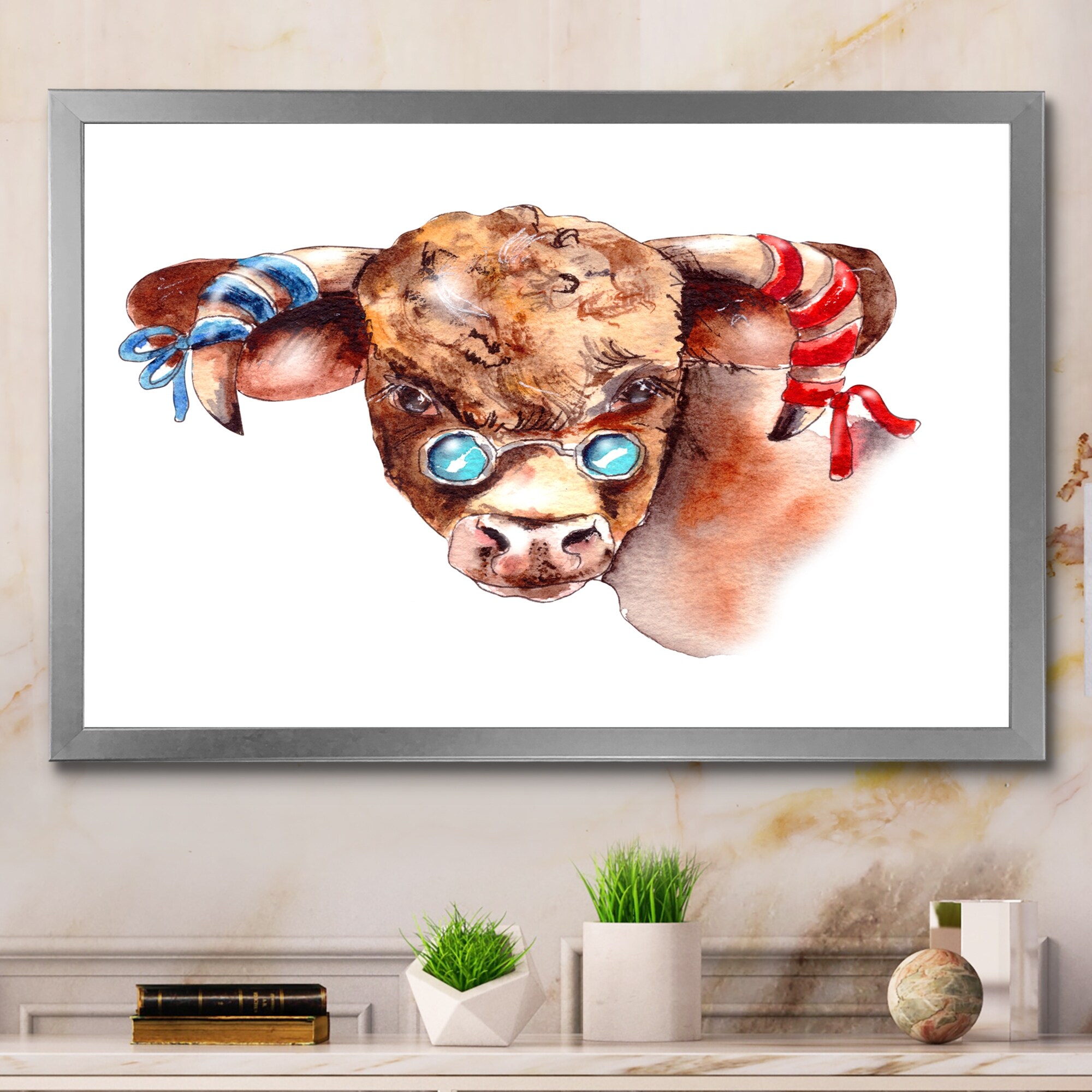 Designart "Carton Hipster Bull Portrait" Children's Art Framed Art Print