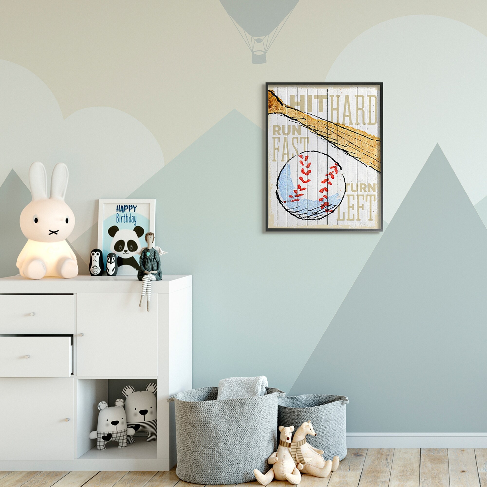 The Kids Room by Stupell Hit Hard Run Fast Turn Left Baseball Sports Word Design Framed Wall Art, Proudly Made in USA