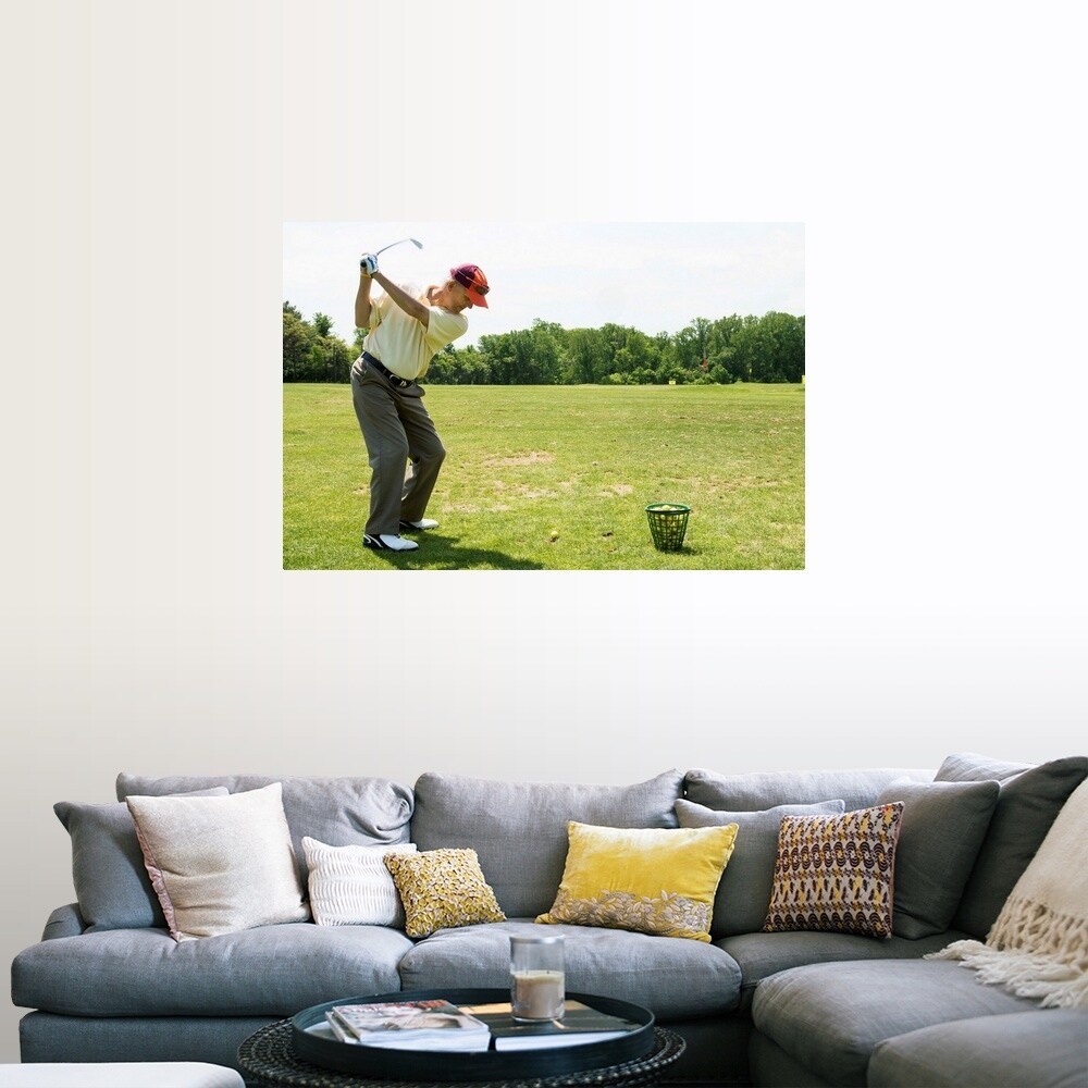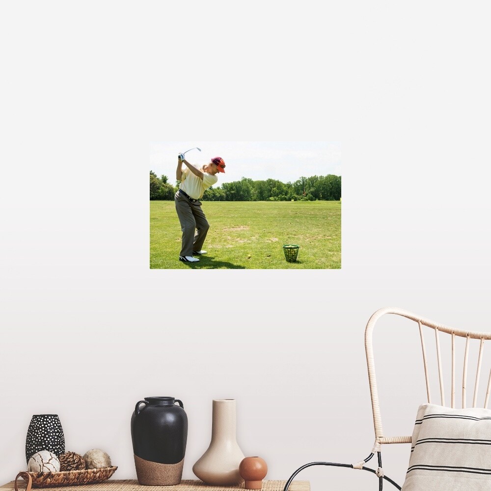 "Senior golfer hitting practice balls at a range" Poster Print - Multi