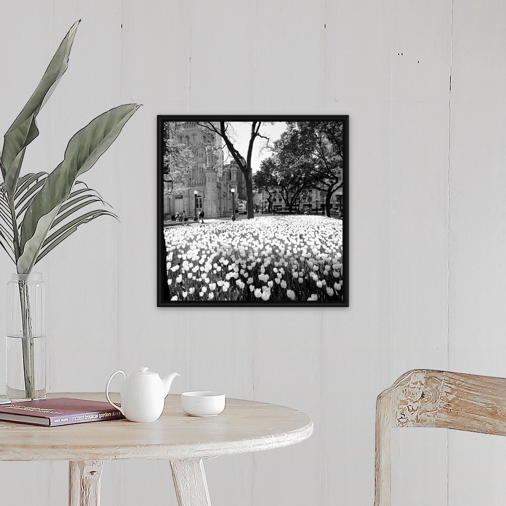 "White tulips near a water tower, Chicago Water Tower, Michigan Avenue, Illinois" Black Float Frame Canvas Art
