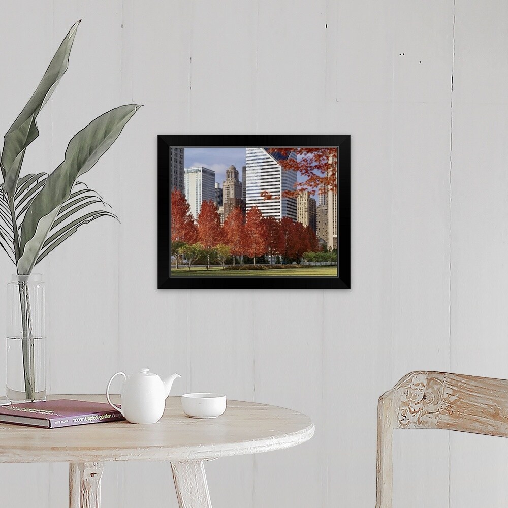 "Illinois, Chicago, Millennium Park, Trees in a park during Autumn" Black Framed Print