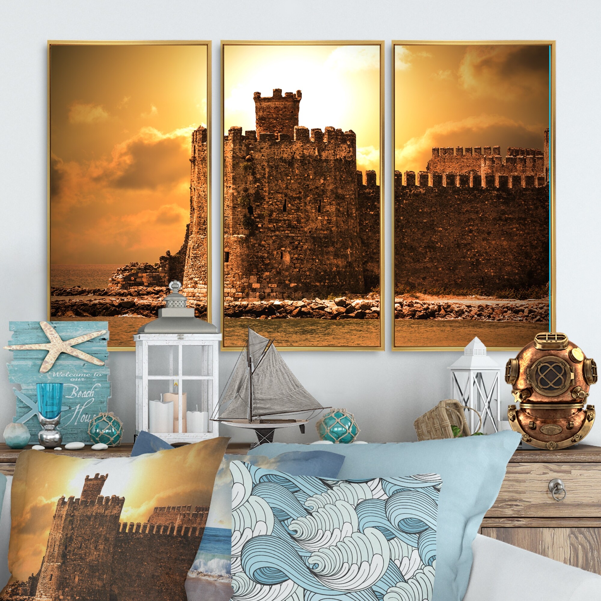 Designart "Old Castle at Sunset" Landscape Framed Canvas Wall Art Set of 3 - 4 Colors of Frames