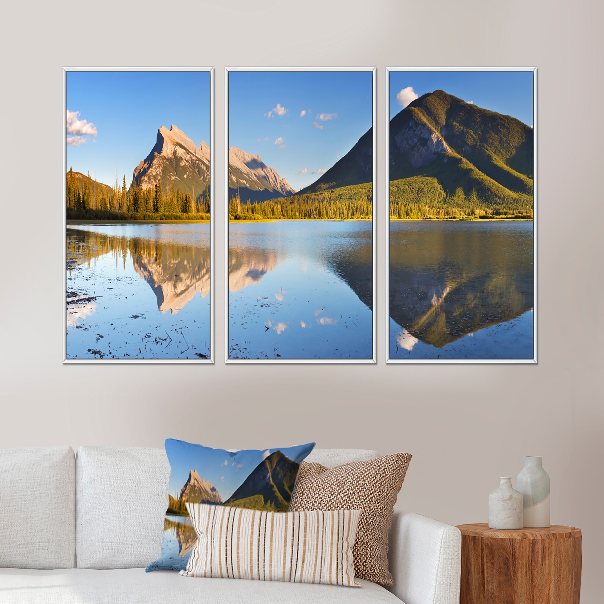 Designart "Vermillion Lakes and Mount Rundle" Landscape Framed Canvas Wall Art Print Set of 3 - 4 Colors of Frames