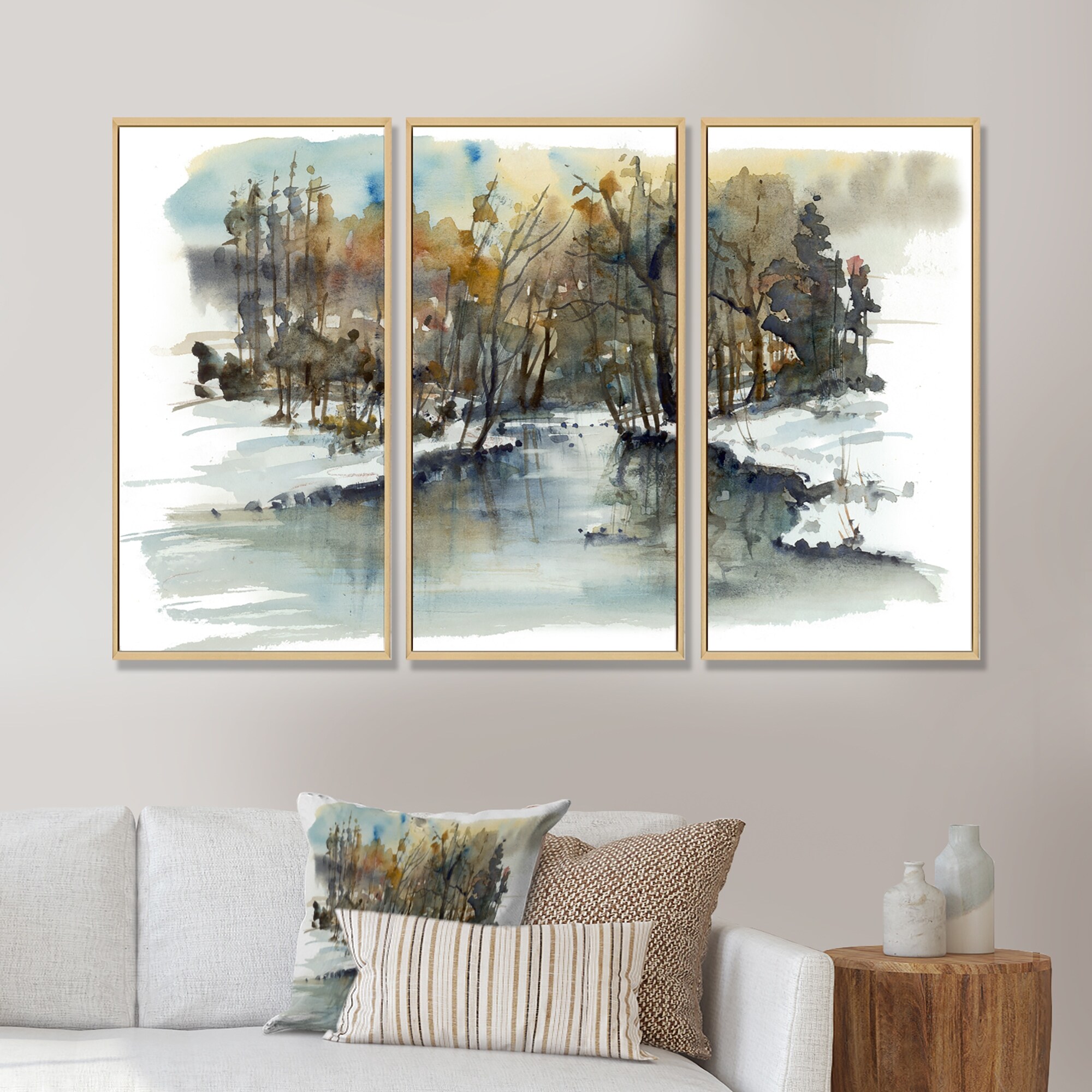 Designart "River in Woods Watercolor" Landscape Framed Artwork Set of 3 - 4 Colors of Frames