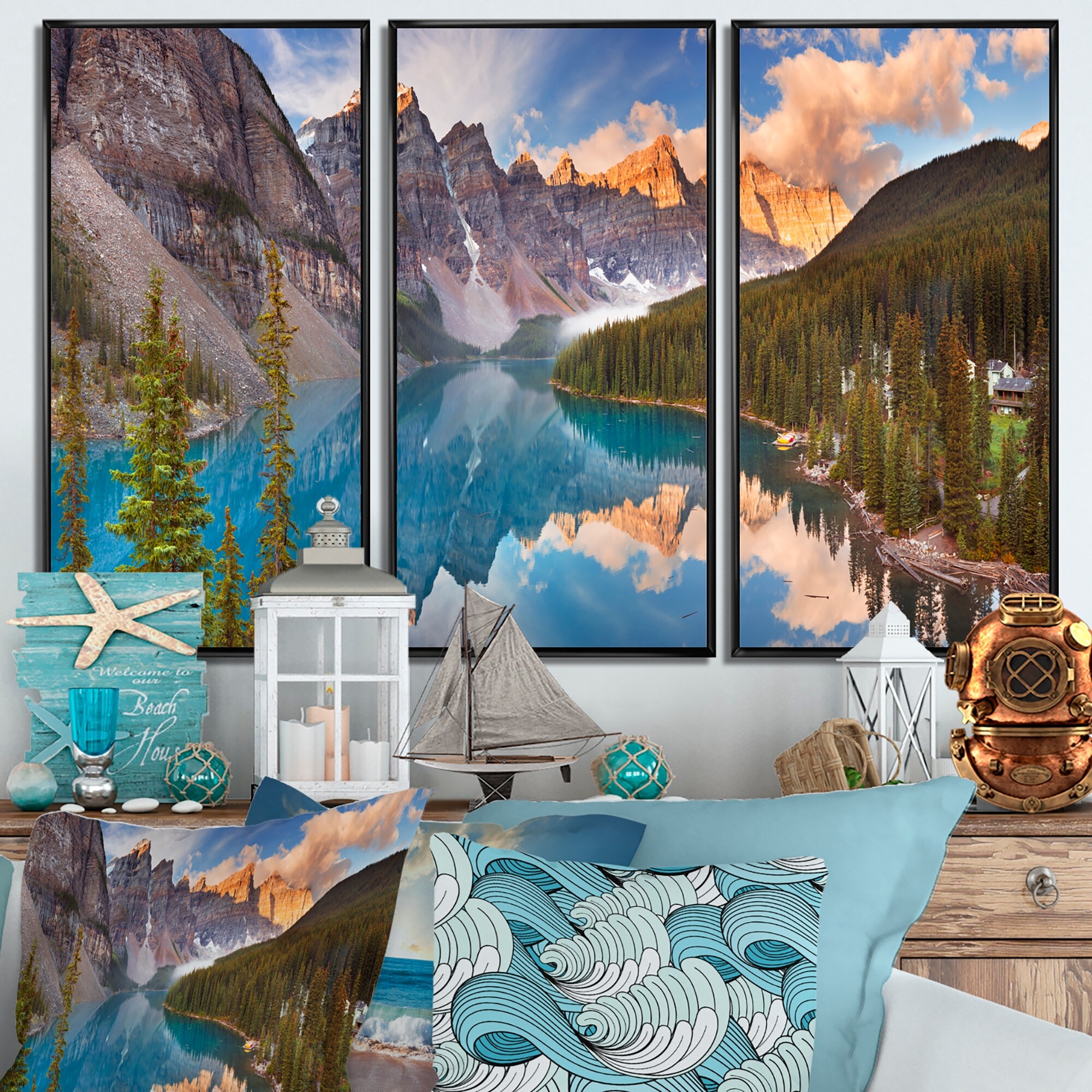 Designart "Moraine Lake in Banff Park Canada" Landscape Framed Wall Decor Set of 3 - 4 Colors of Frames