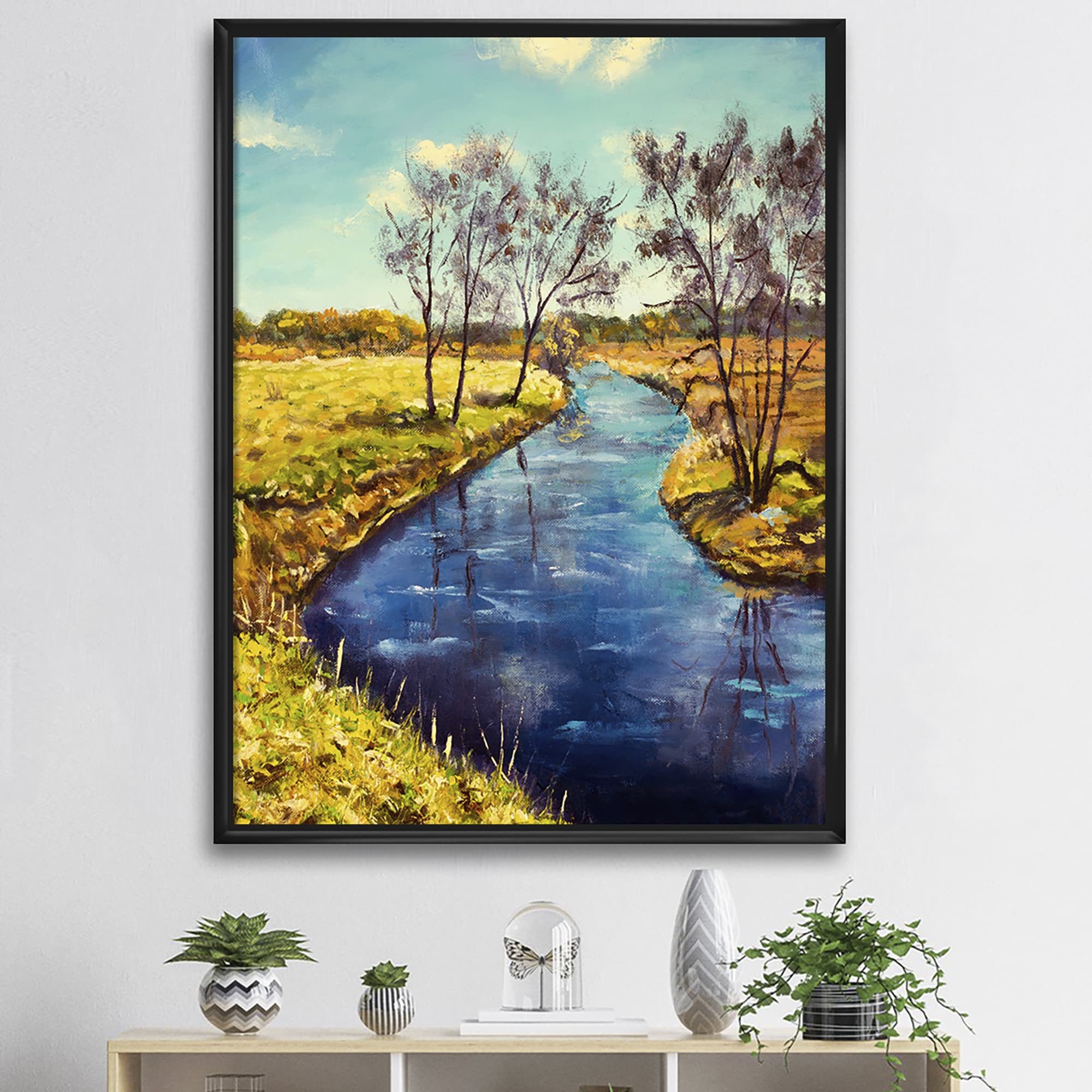 Designart "Sunny River Through Bright Landscape" Traditional Framed Canvas Wall Art Print