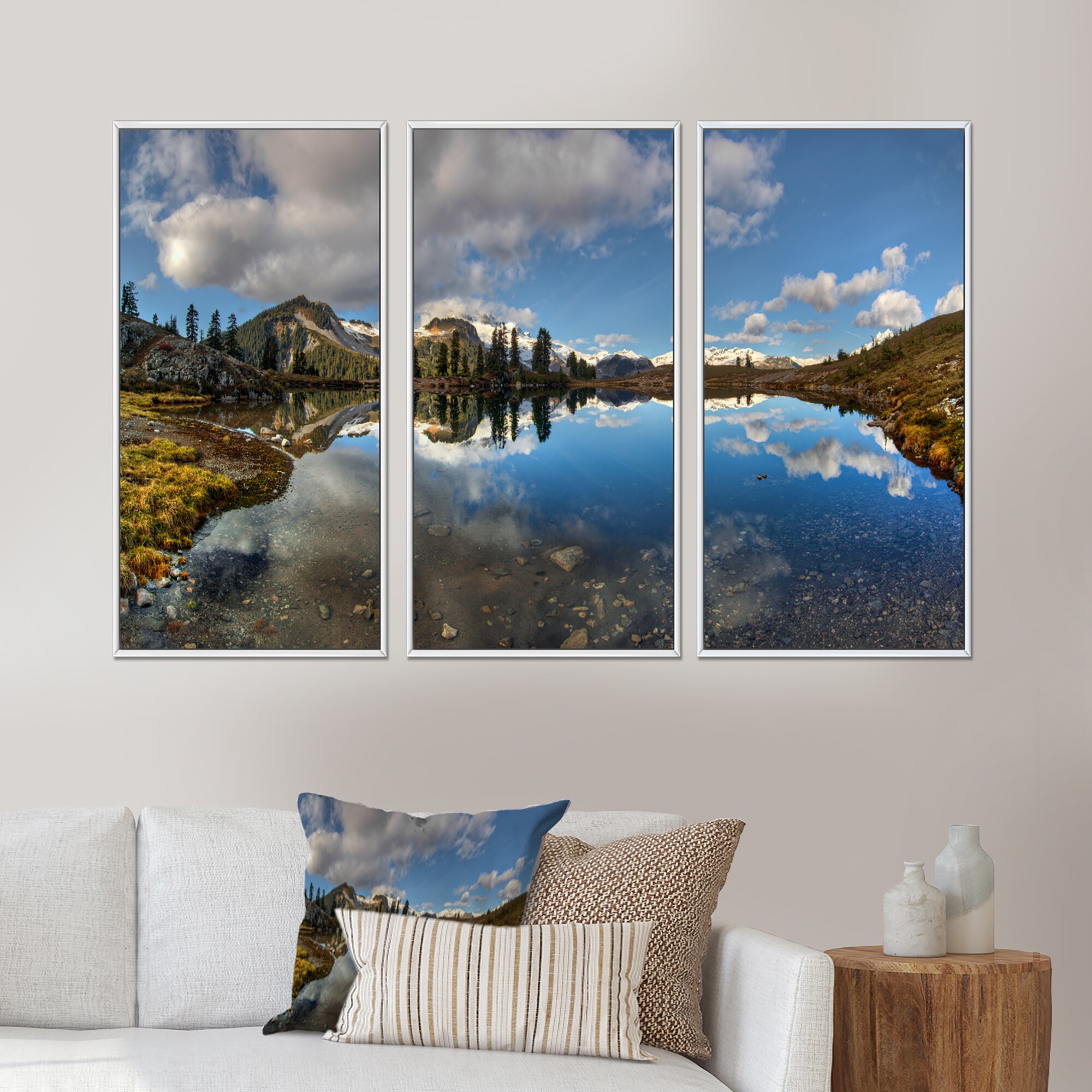 Designart "Clear Lake with Pine Trees Panorama" Landscape Framed Wall Decor Set of 3 - 4 Colors of Frames