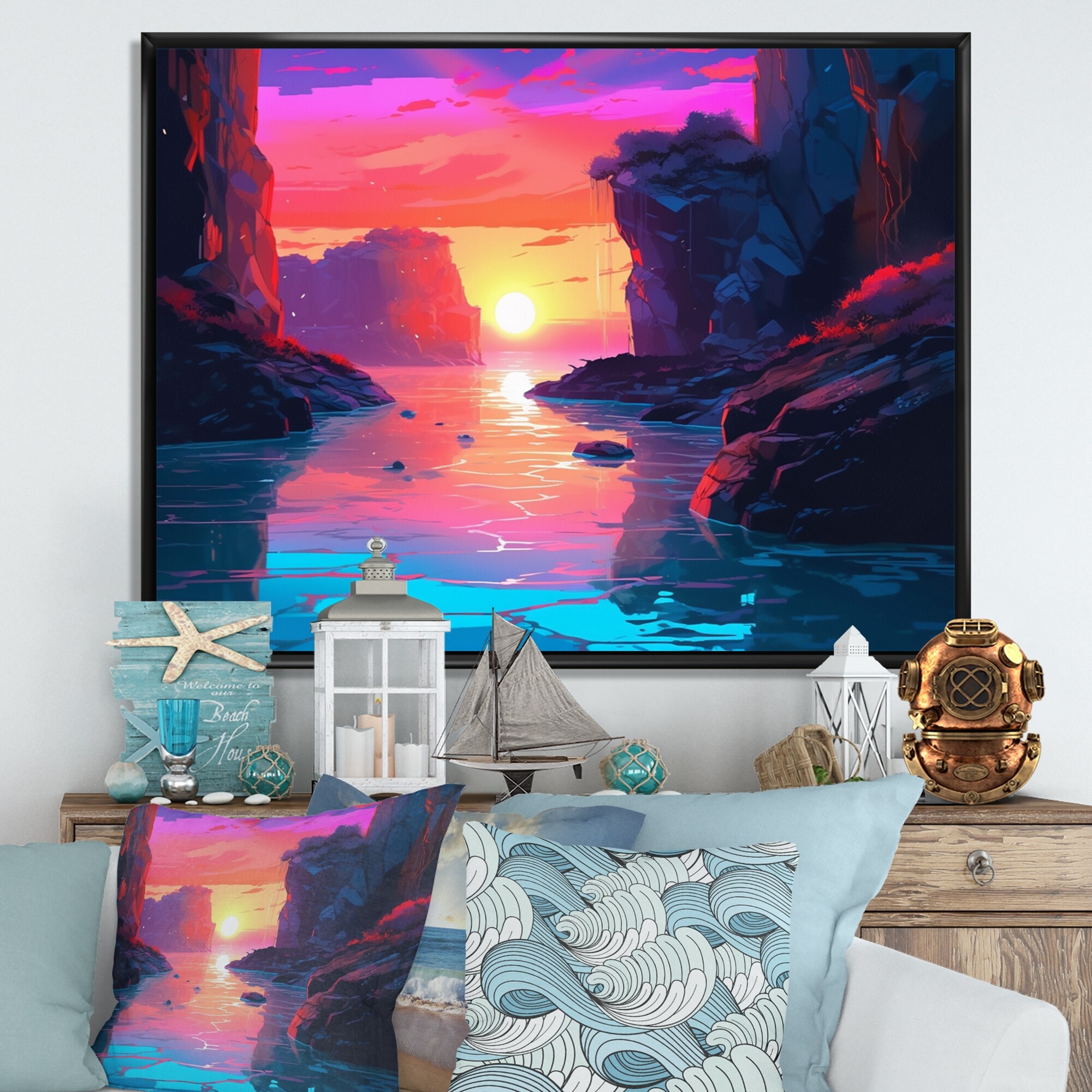 Designart "Sunset"S Embrace At the Beach Ii" Modern Landscape Beach Framed Wall Art Prints
