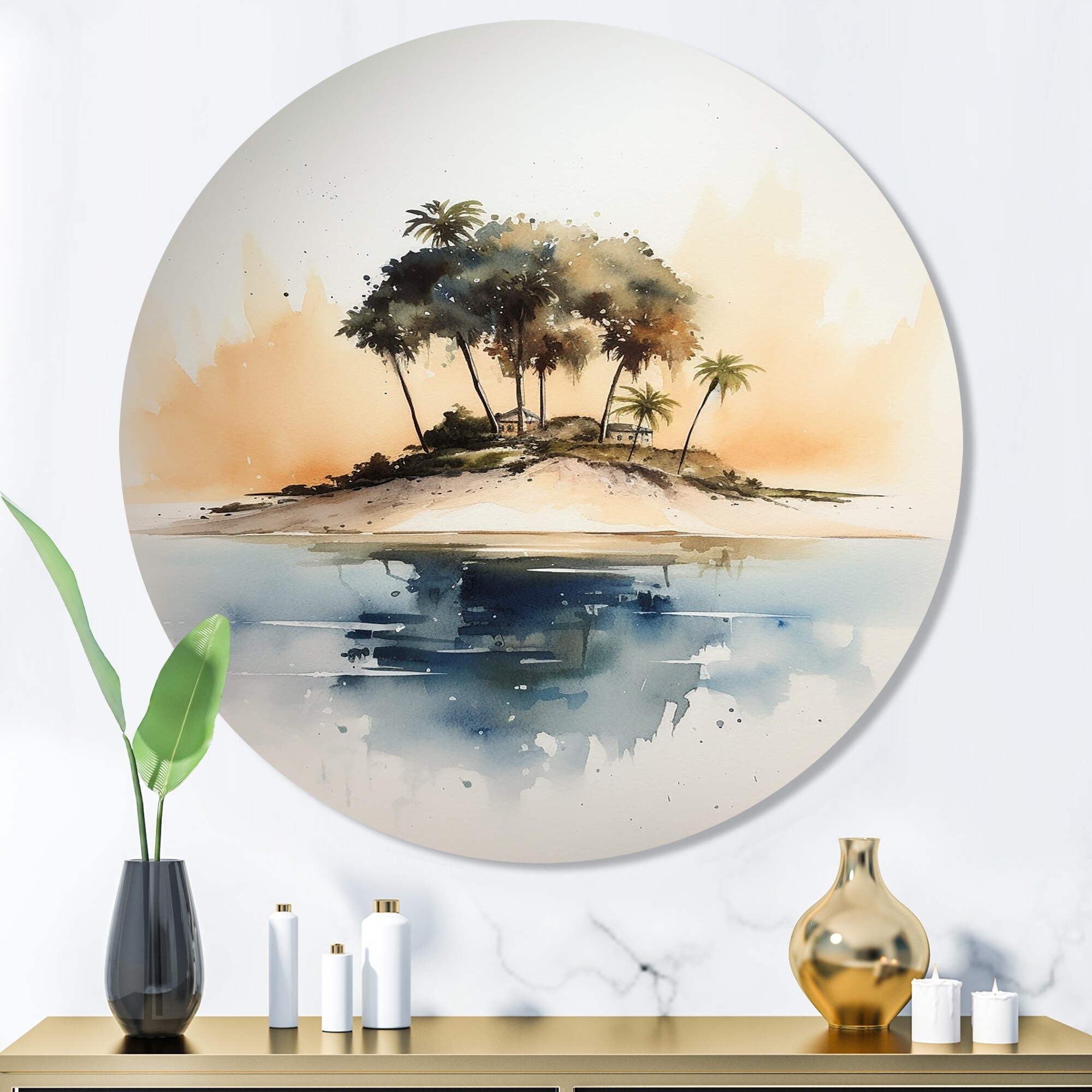 Designart "Deserted Tropical Island IV" Modern Landscape Beach Metal Round Wall Art