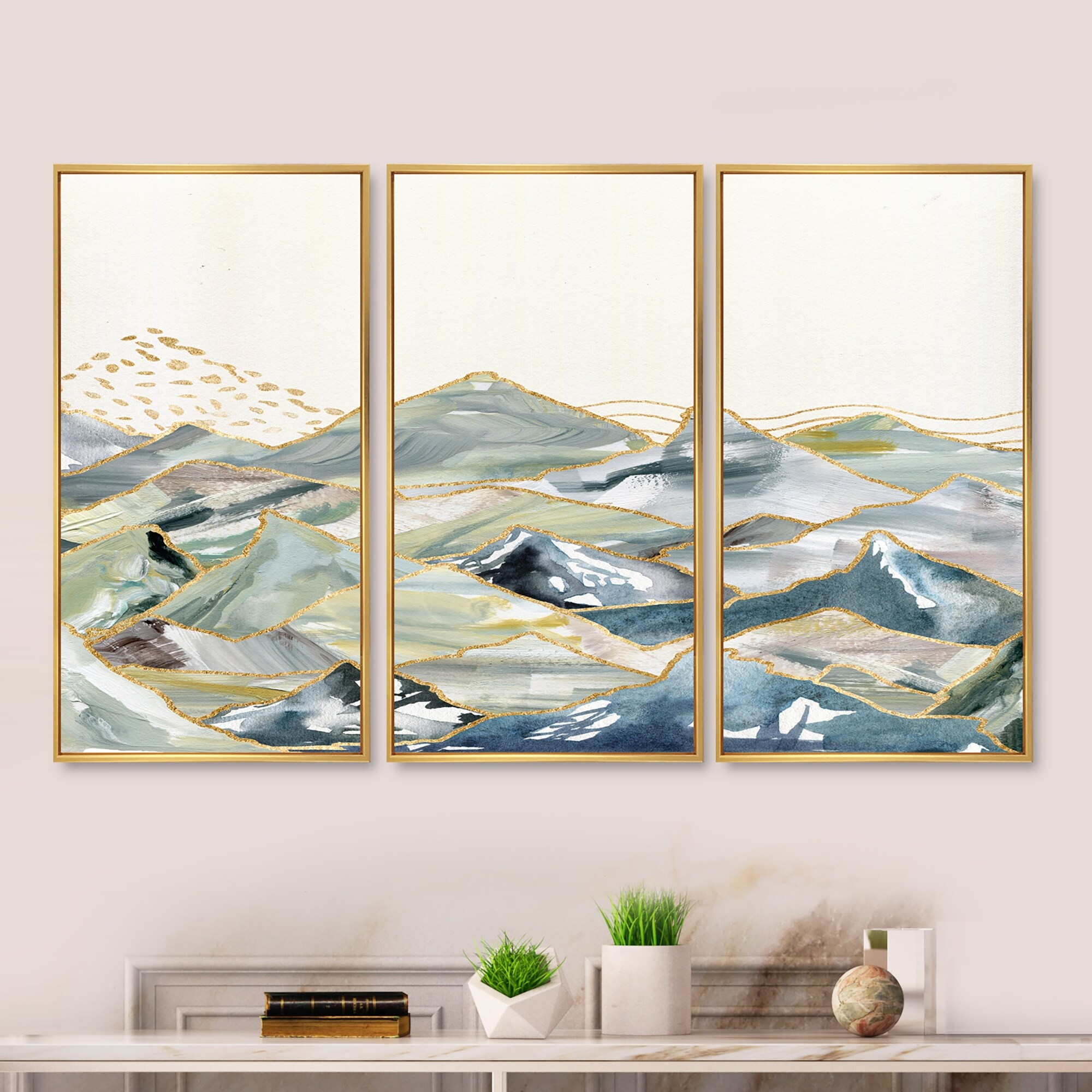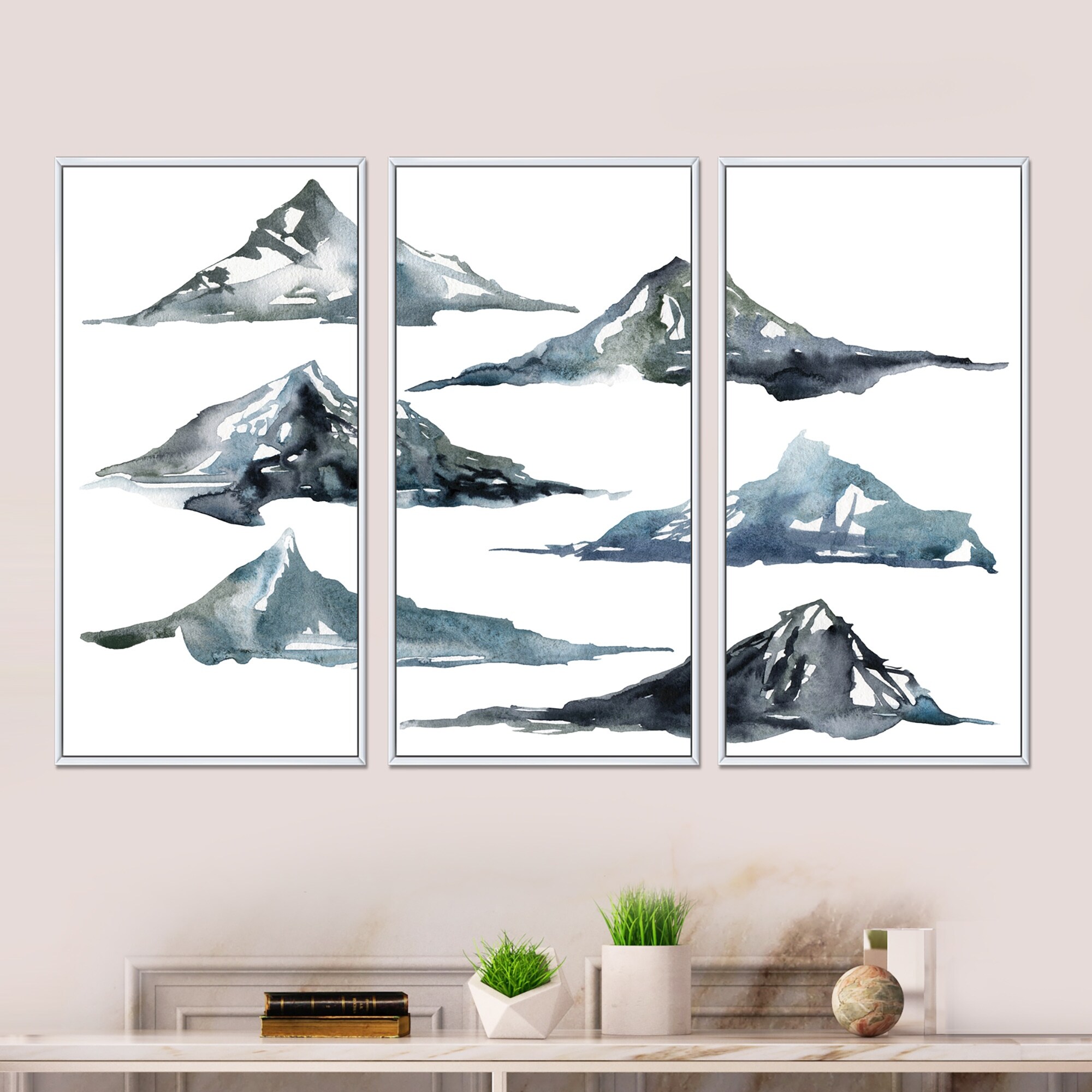Designart "Minimalistic Gouache Landscape III" Modern Framed Canvas Wall Art Set of 3 - 4 Colors of Frames