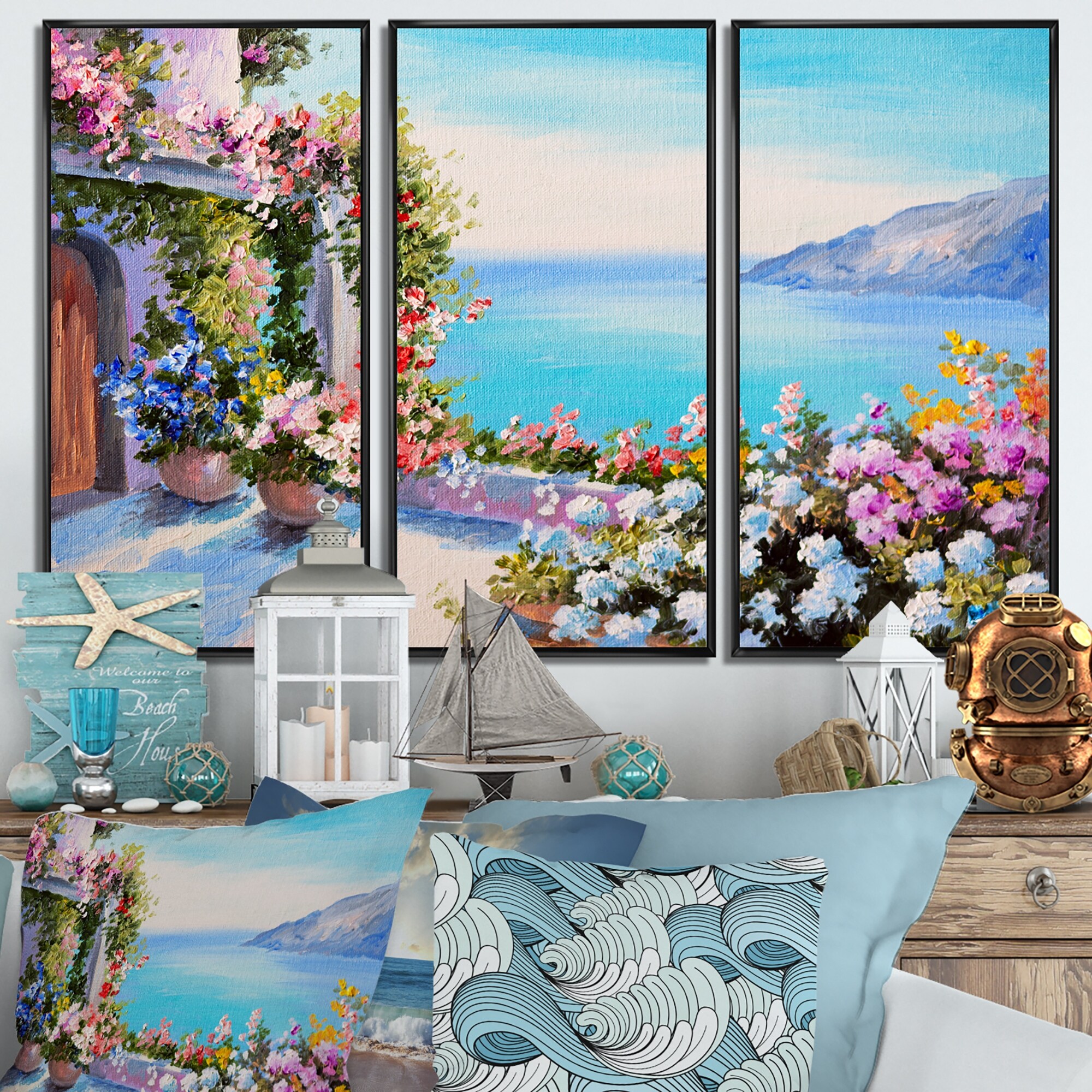 Designart "Sea and Flowers" Landscape Framed Canvas Wall Art Print Set of 3 - 4 Colors of Frames