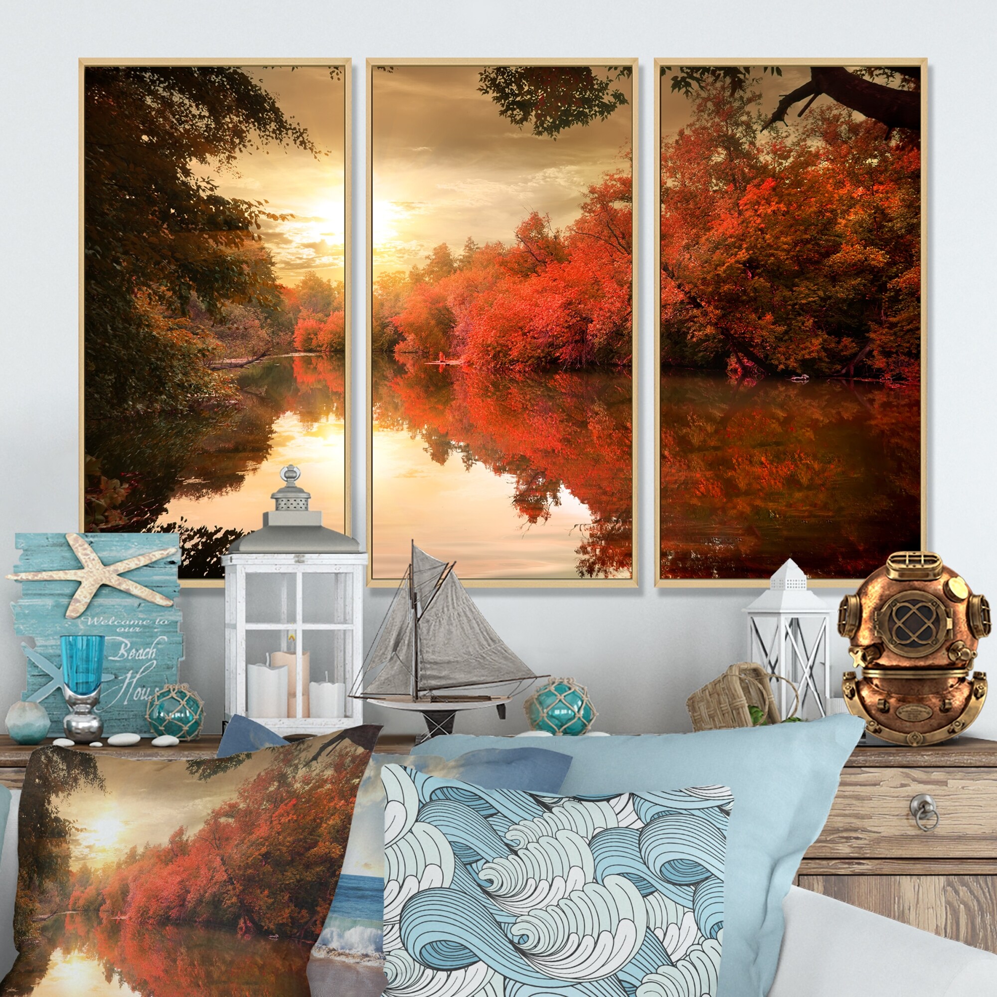 Designart "Colorful Fall Sunset over River" Landscape Framed Canvas Wall Art Print Set of 3 - 4 Colors of Frames