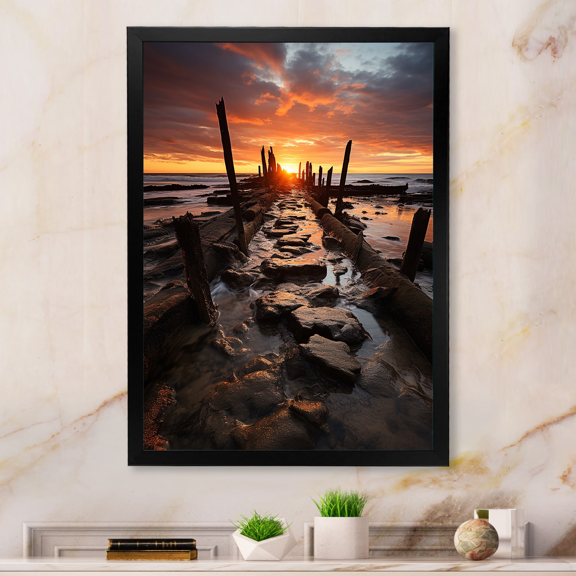 Designart "Peach Black Miami Pier Serenity" City Miami Framed Canvas Wall Art