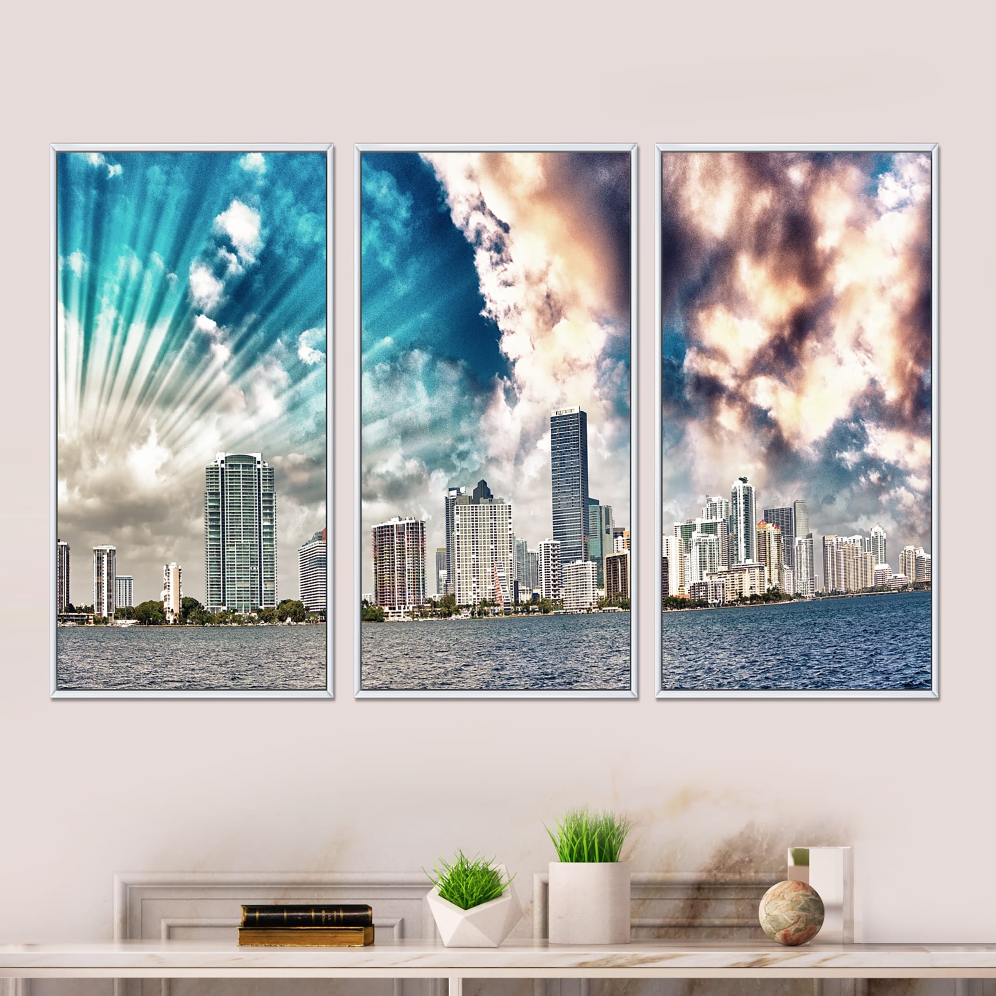 Designart "Miami Skyline with Clouds" Cityscape Framed Wall Decor Set of 3 - 4 Colors of Frames
