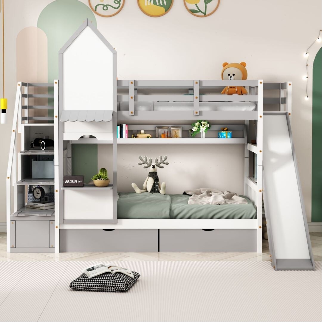 Grey Twin-Over-Twin Bed with 2 Drawers 3 Shelves and Slide