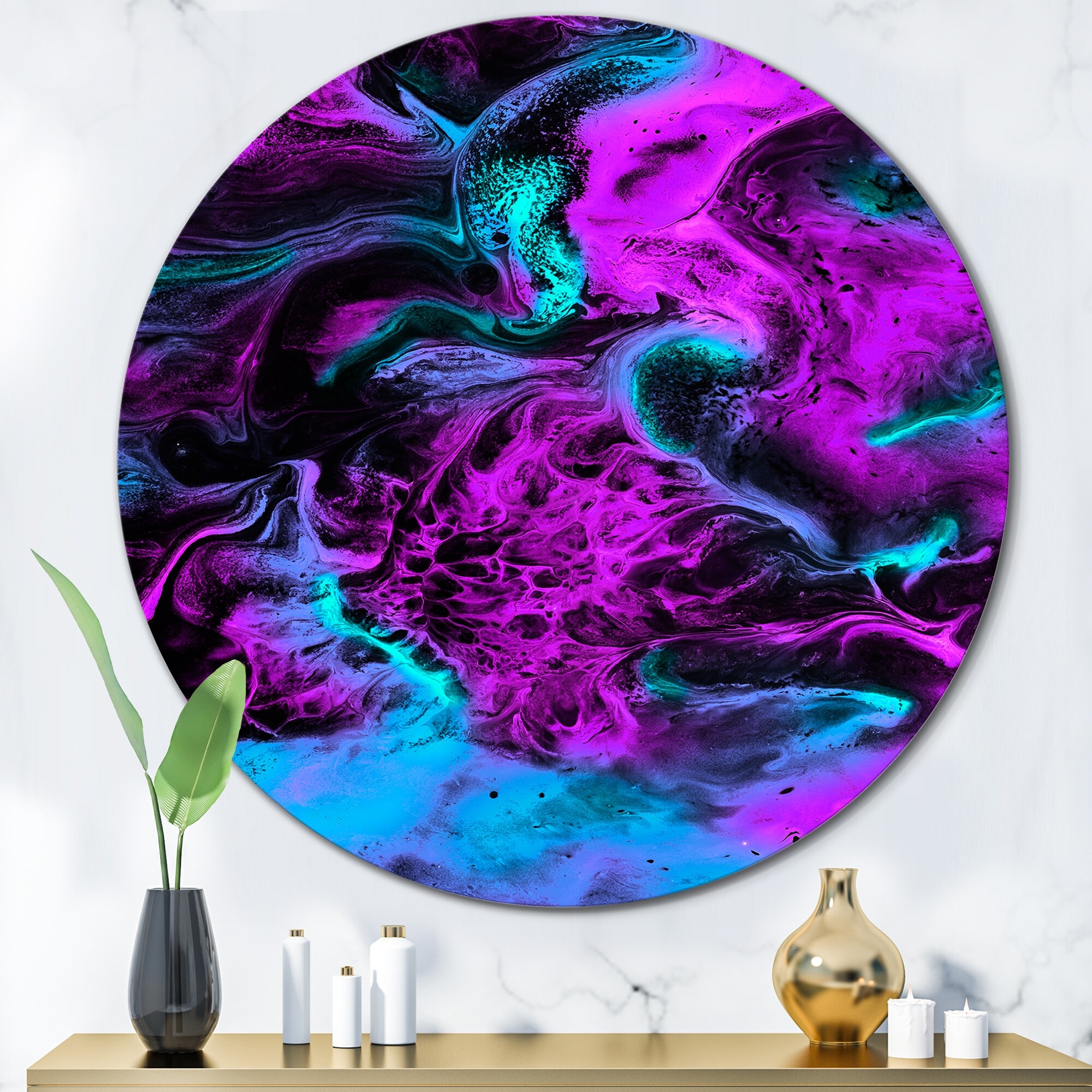 Designart 'Neon Pink Blue And Green Liquid Art Landscape' Modern Metal Circle Wall Art