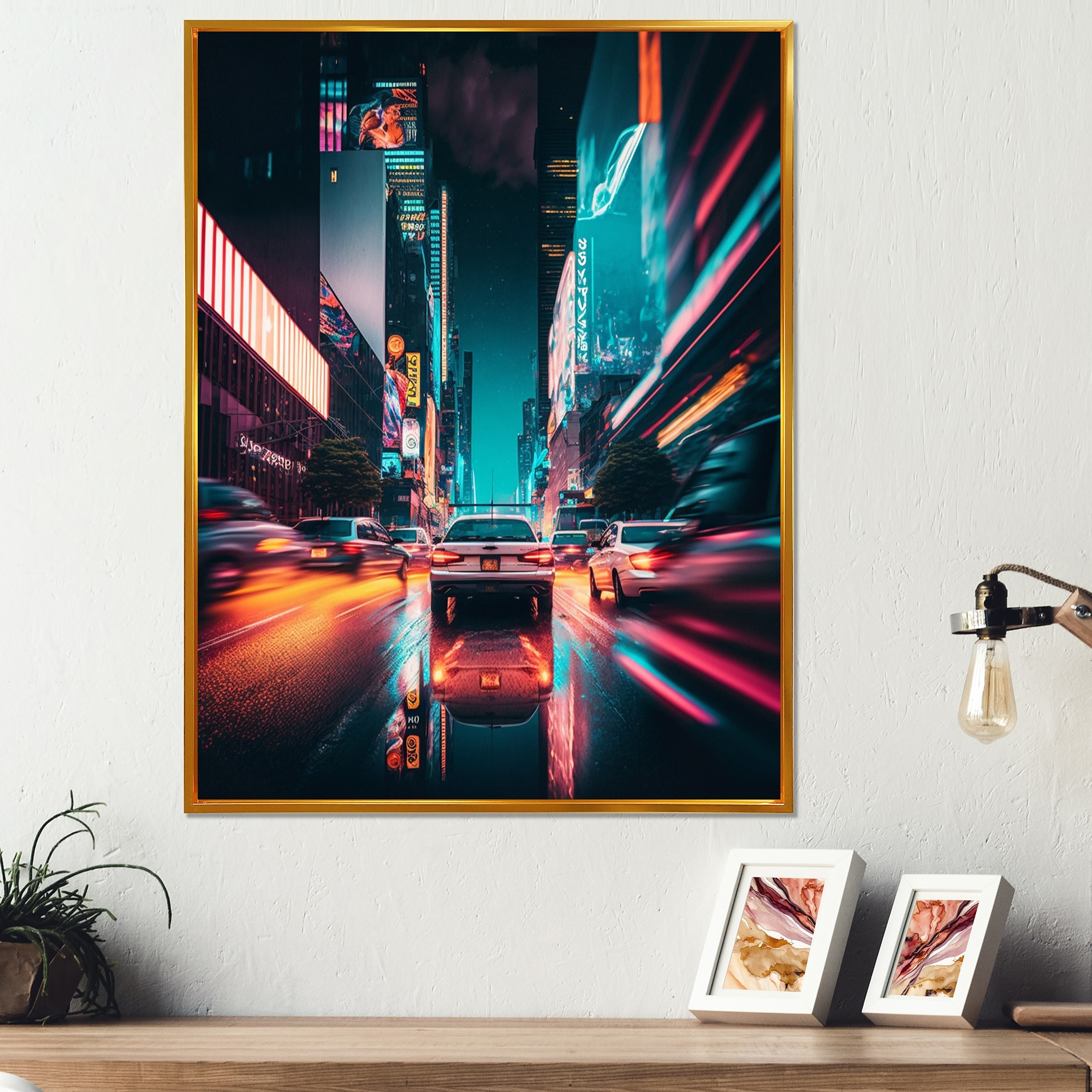 Designart "Futuristic New York City Neon IV" Cityscapes Framed Canvas Art Print