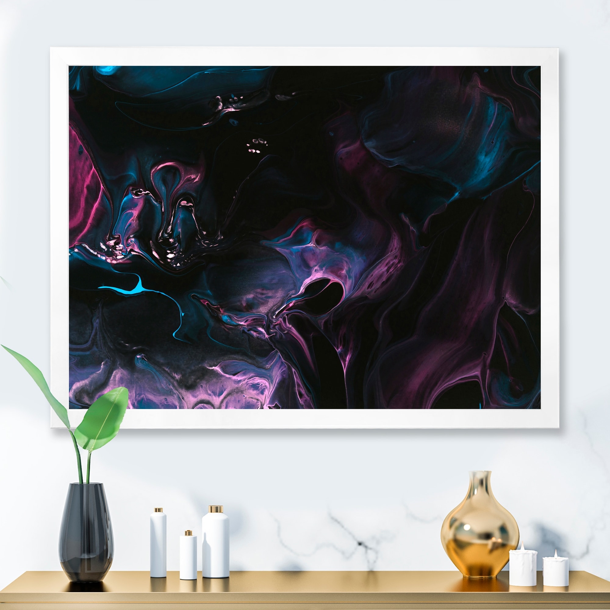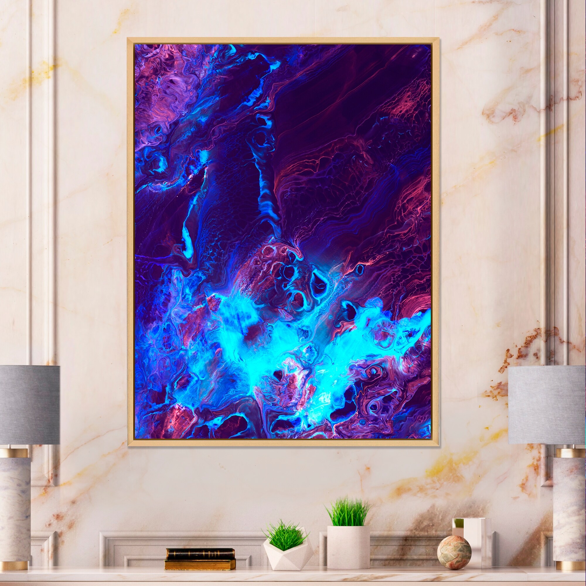 Designart "Neon Liquid Art in Purple And Blue" Modern Framed Canvas Wall Art Print