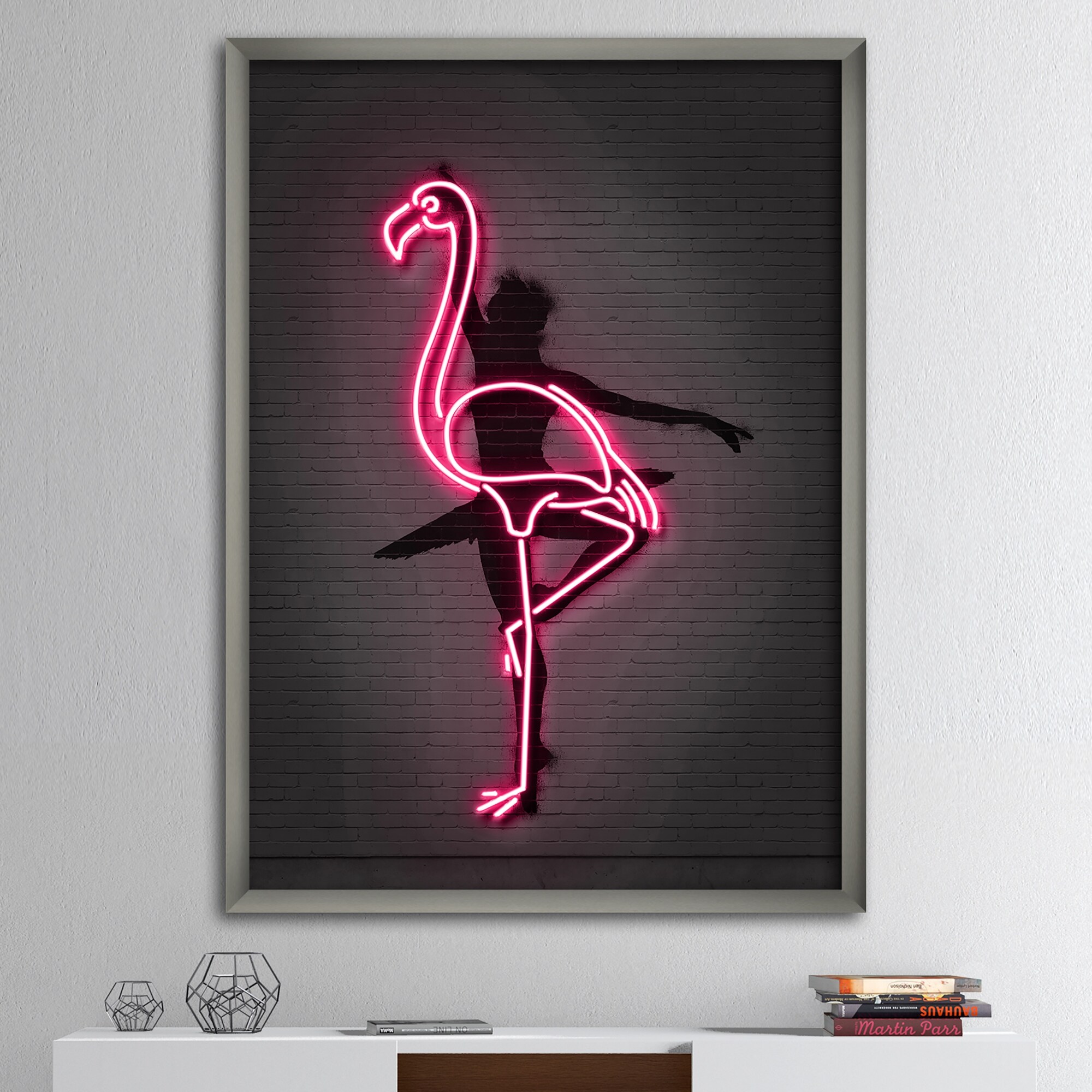 Designart "Neon Pink Flamingo and Ballerina" Modern & Contemporary Framed Canvas Wall Art