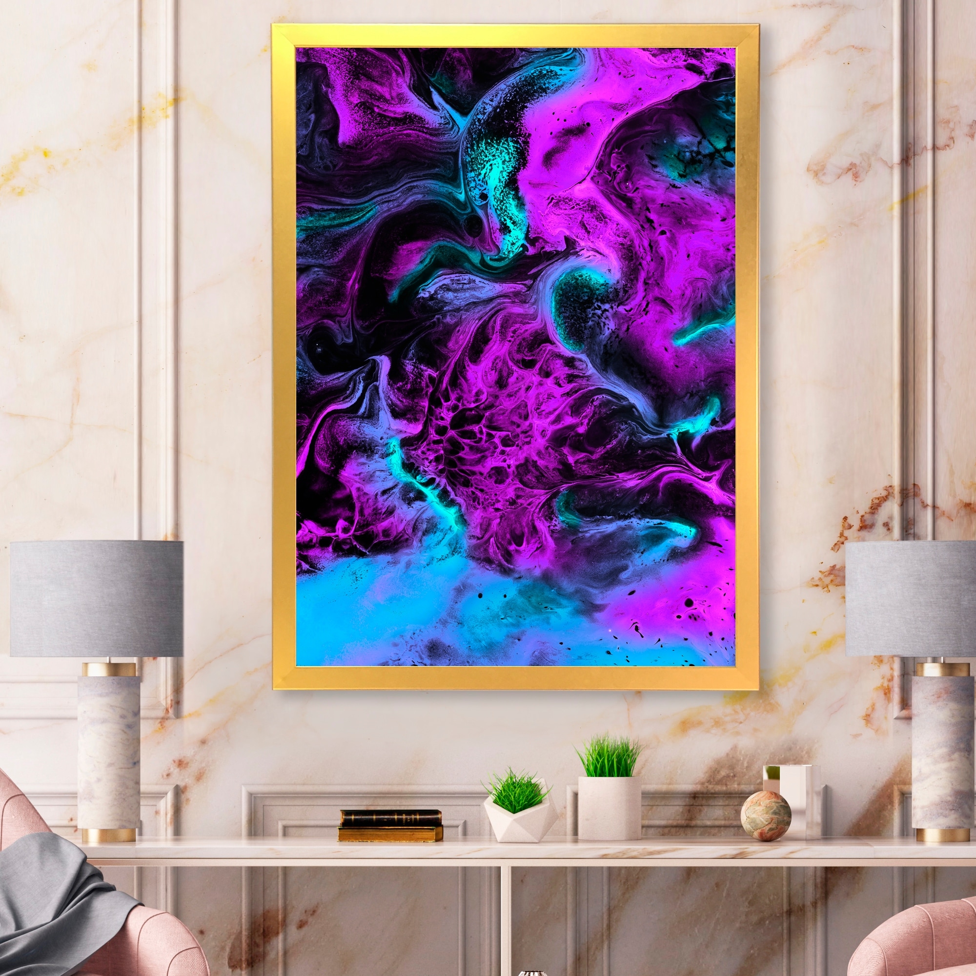 Designart "Pink Neon Marble on Black" Modern Framed Art Print