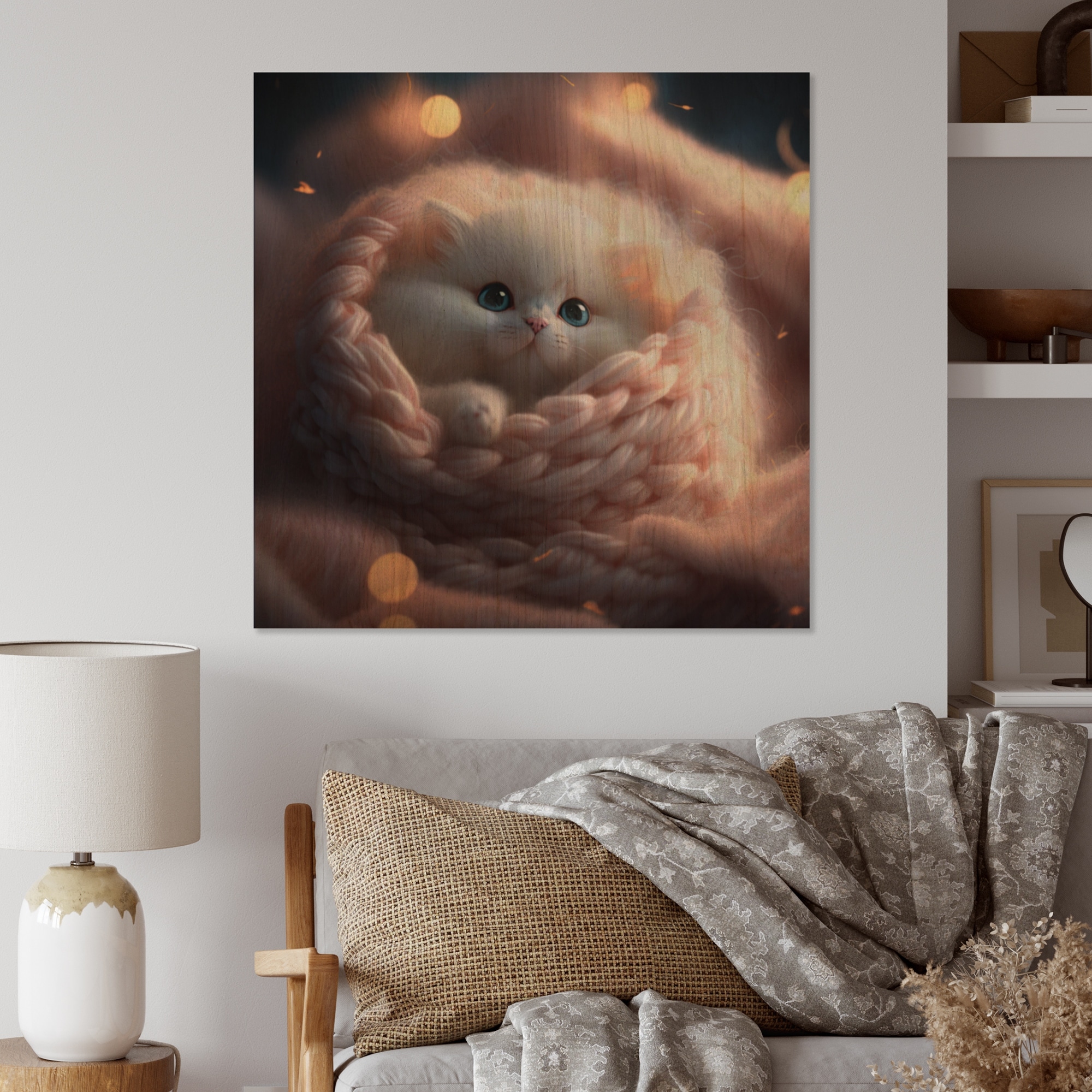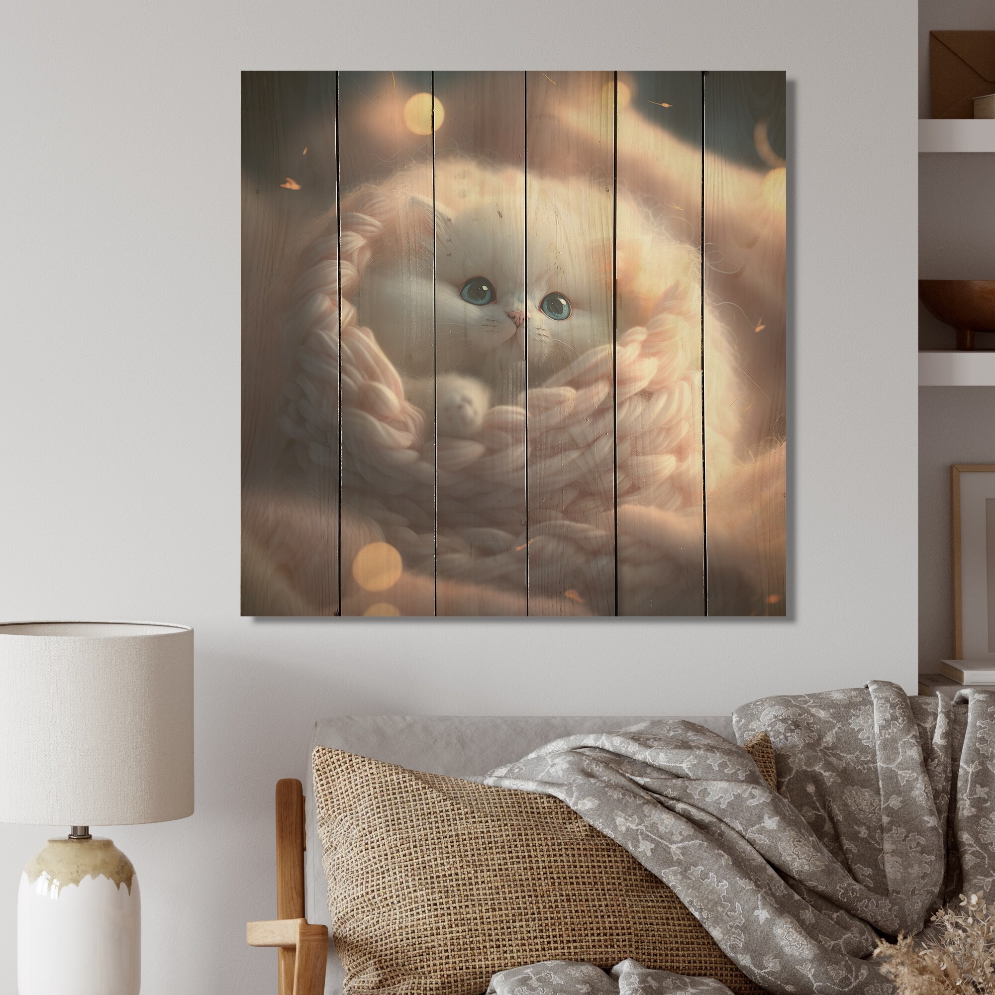 Designart 'Cute Little White Kitten in Knitted Nest' Animals Cat Wood Wall Art - Natural Pine Wood