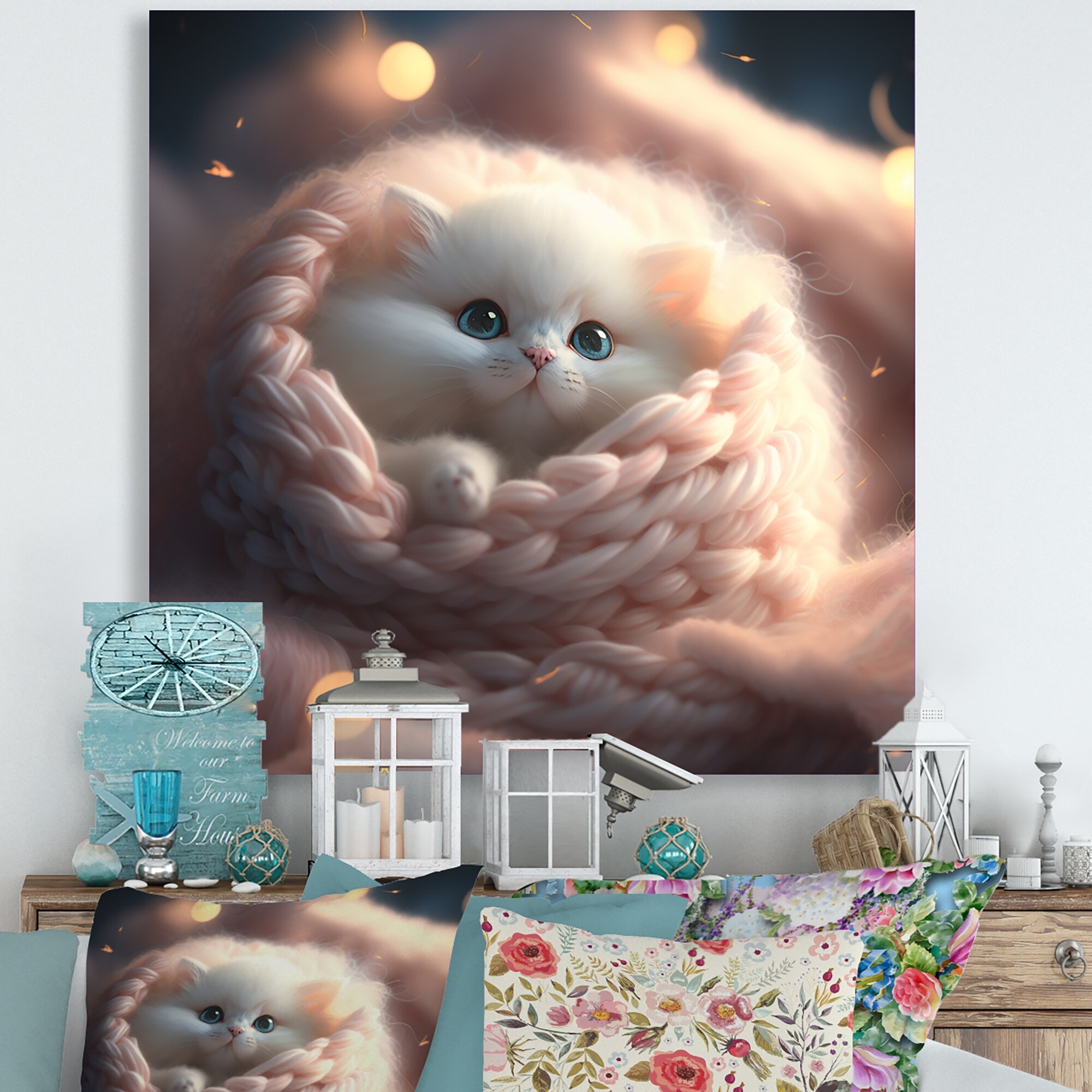 Designart "Cute Little White Kitten in Knitted Nest" Animals Cat Canvas Wall Art