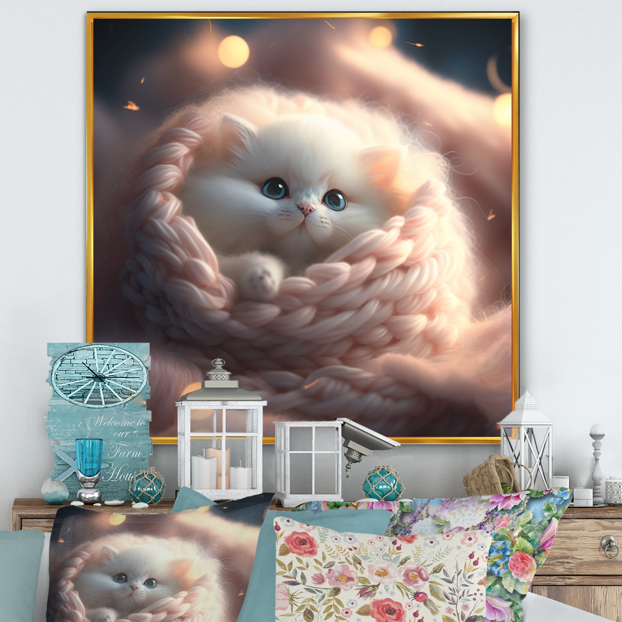 Designart "Cute Little White Kitten in Knitted Nest" Animals Cat Framed Canvas Wall Art Print