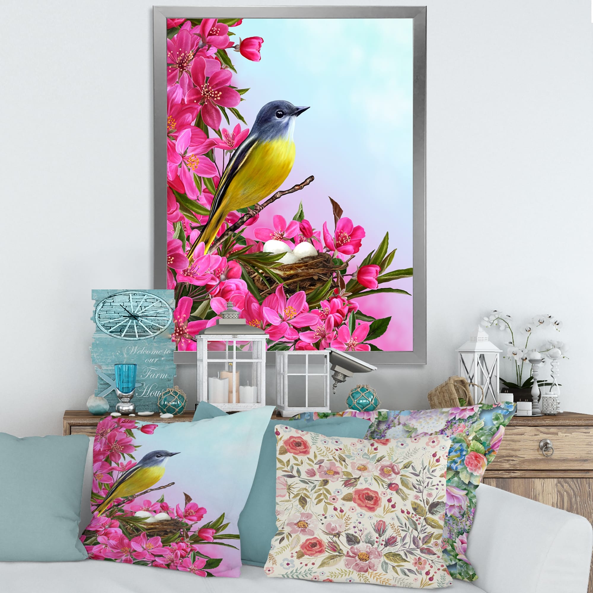 Designart "Little Yellow Bird Near the Nest with Flowers" Traditional Framed Art Print
