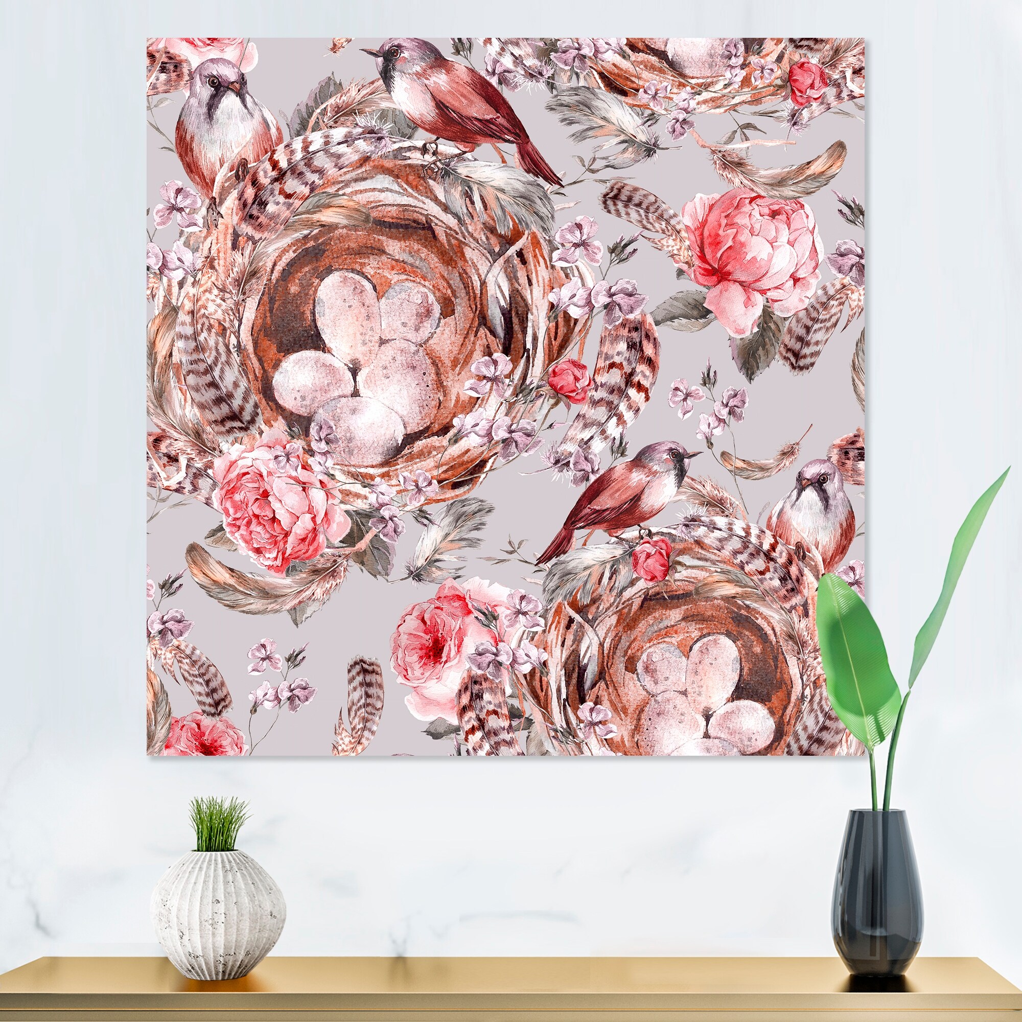 Designart "Vintage Pattern With Rose Birds Nests, Feathers I" Patterned Canvas Wall Art Print