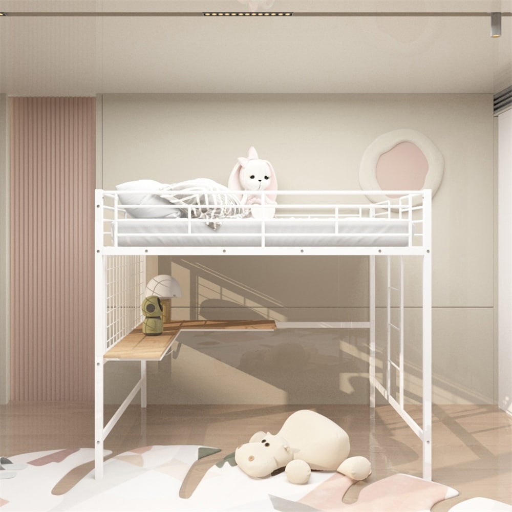 Twin Size Metal Loft Bed with Built-in L-Shaped Wood Desk, Metal Grid and Heavy-Duty Metal Slats
