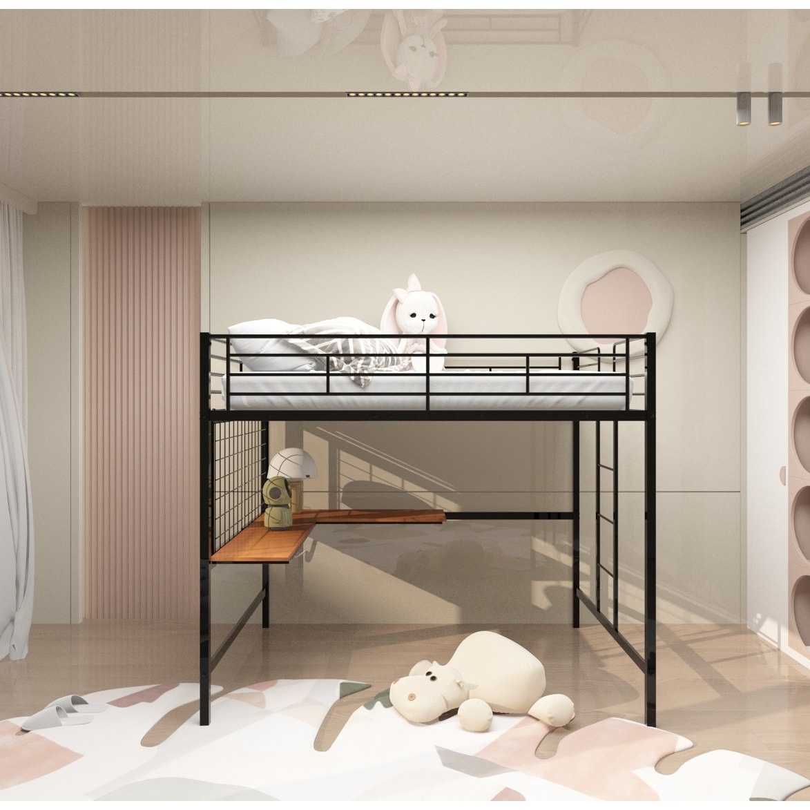 Metal Loft Bed with Desk and Metal Grid