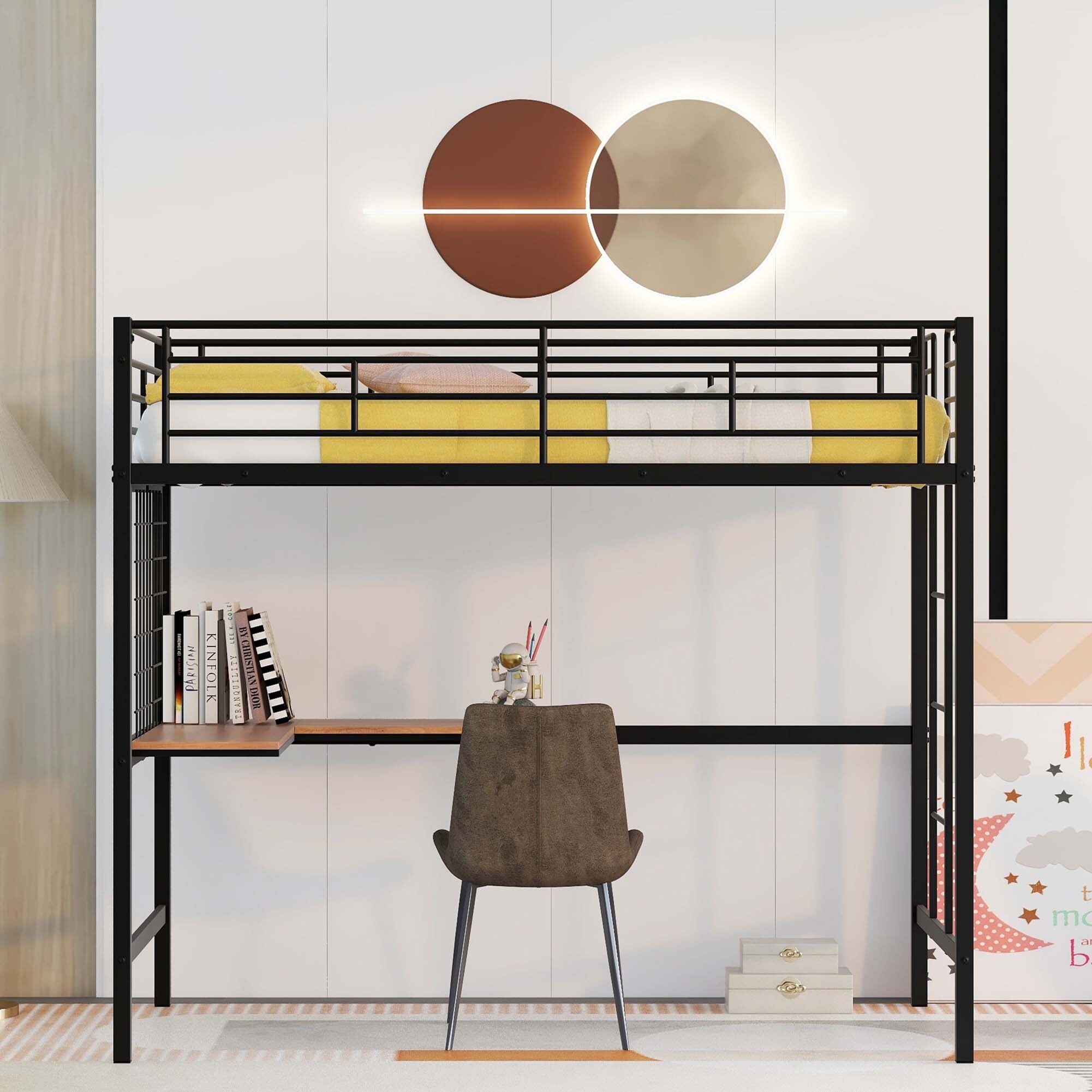 Twin Metal Loft Bed Bedroom Kids' Beds with Desk and Metal Grid, Built-in Ladders