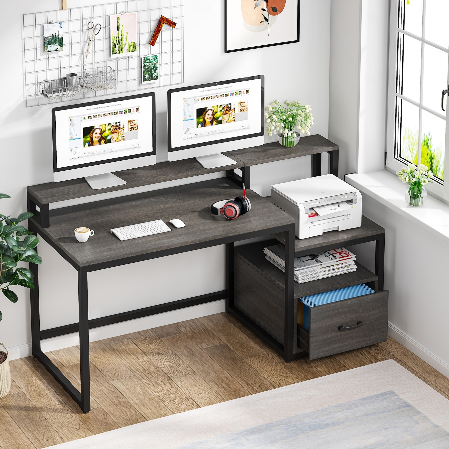 Computer Desk with File Drawer and Storage Shelves, Industrial Home Office Desk with Hutch