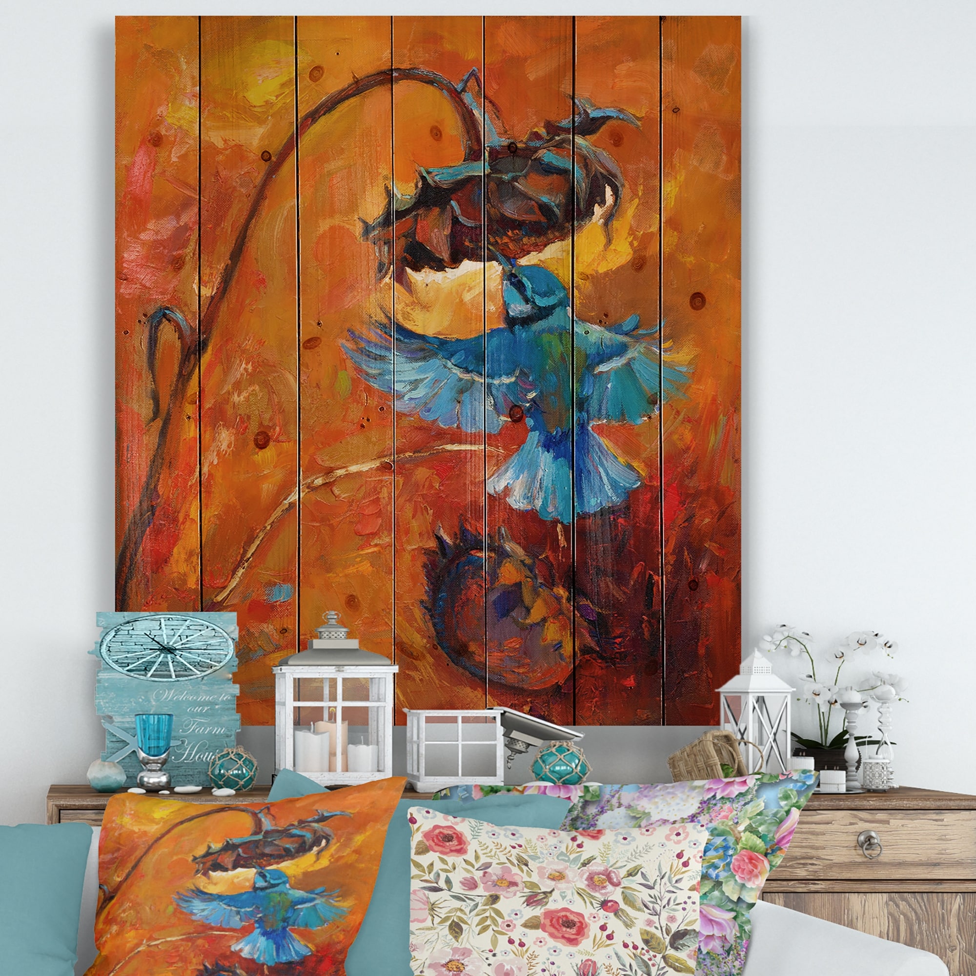 Designart 'Blue Hummingbird on Orange' Traditional Print on Natural Pine Wood